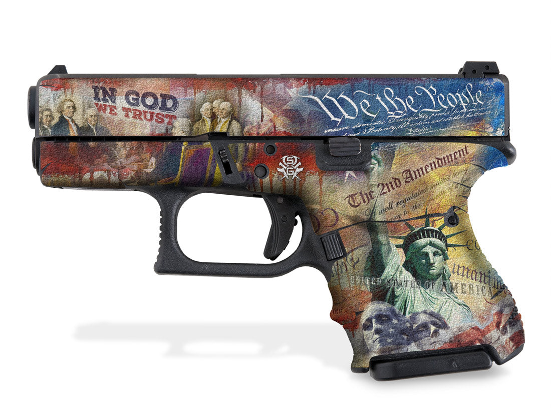Decal Grip Kit for G27 Gen 3 or Gen 4– We The People design. Provides a better grip on the short frame of the Glock 27, giving you more control. Features a textured, rubber-like grip surface. Cover just the frame or add grip the slide as well.