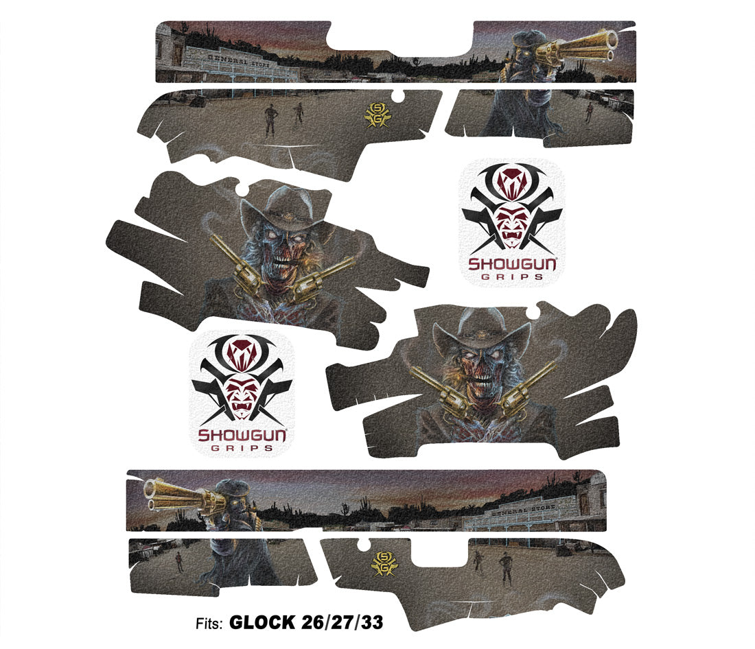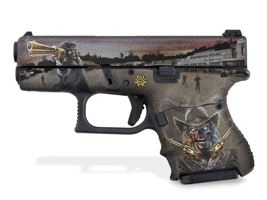 Decal Grip Kit for G27 – Zombie Outlaw by Invision Artworks design. Provides a better grip on the short frame of the Glock 27, giving you more control. Features a textured, rubber-like grip surface. Cover just the frame or add grip the slide as well.