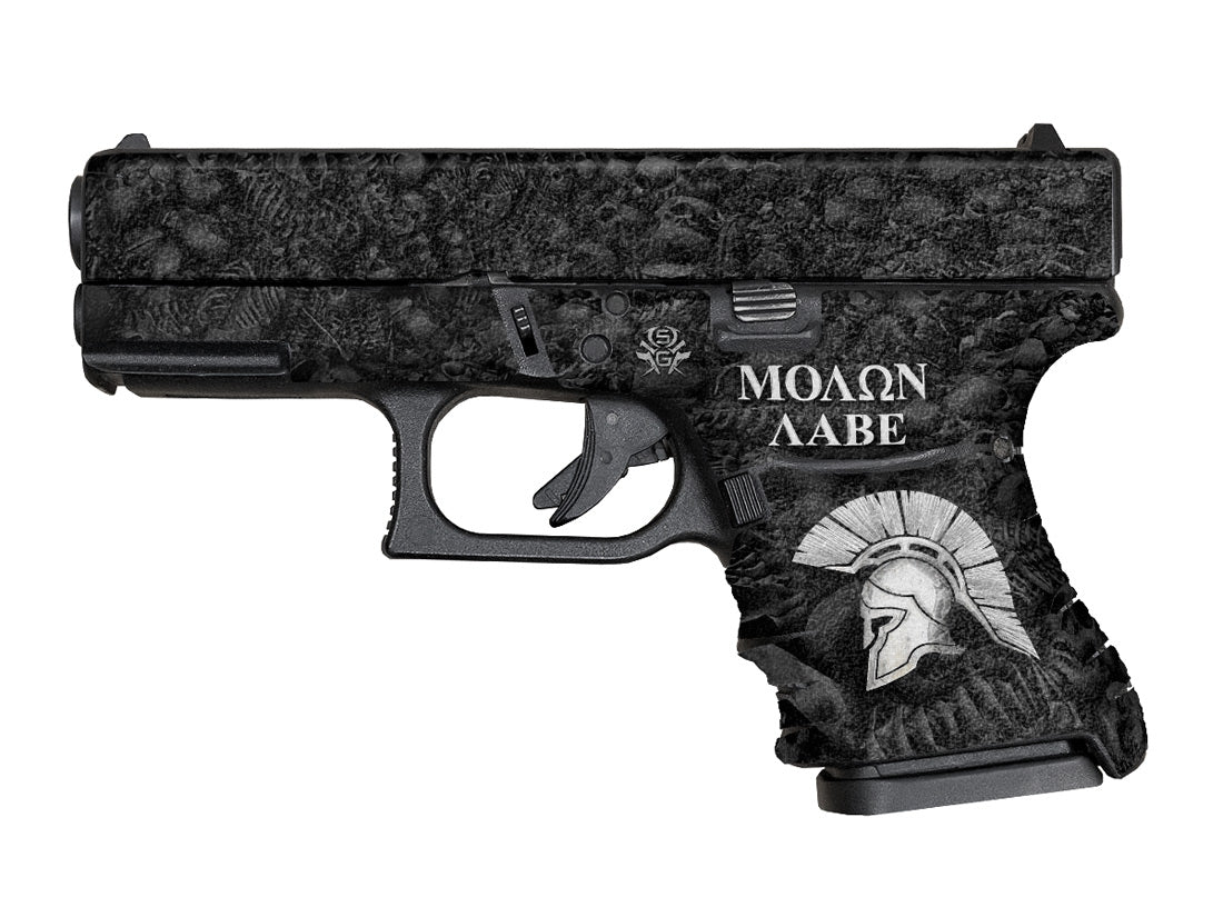 Molon Labe Decal Grip for Glock 29SF – Features an amazing rubber-like, textured grip surface to give you a better hold of the shorter frame of the G29 SF.  Includes trim-to-fit decals to cover factory base plate, extended base plate or aftermarket magazine extension (not shown).