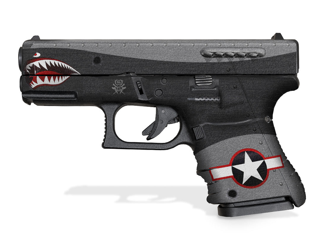 Showgun Decal Grip for Glock 29SF – Features an amazing rubber-like, textured grip surface to give you a better hold of the shorter frame of the G29 SF.  Includes trim-to-fit decals to cover factory base plate, extended base plate or aftermarket magazine extension (not shown). War Machine design by Invision Artworks.