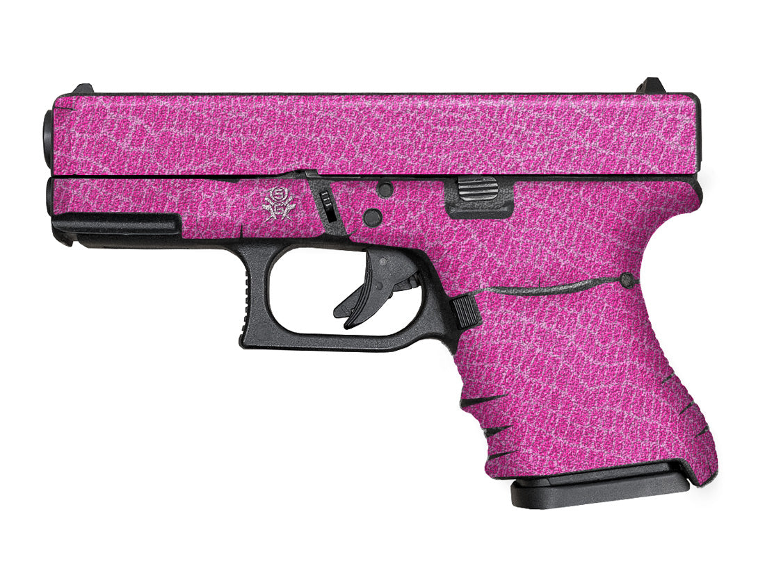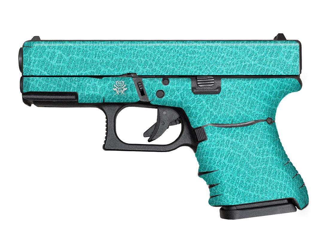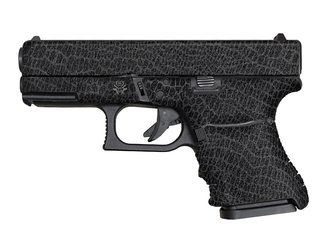 Showgun Decal Grip for Glock 30SF – Features an amazing rubber-like, textured grip surface to give you a better hold of the shorter frame of the G30 SF.  Includes trim-to-fit decals to cover factory base plate, extended base plate or aftermarket magazine extension (not shown). Reptilian design.