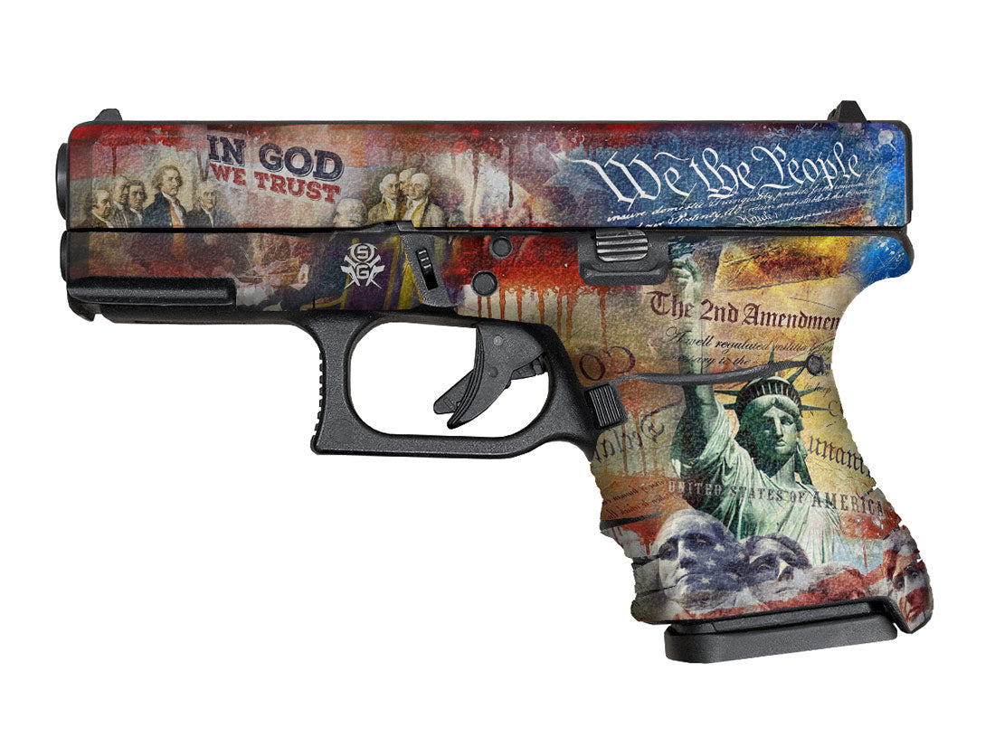 Showgun Tactical Decal Grip for Glock 30SF – Features an amazing rubber-like, textured grip surface to give you a better hold of the shorter frame of the G30 SF.  Includes trim-to-fit decals to cover factory base plate, extended base plate or aftermarket magazine extension (not shown). We The People design.
