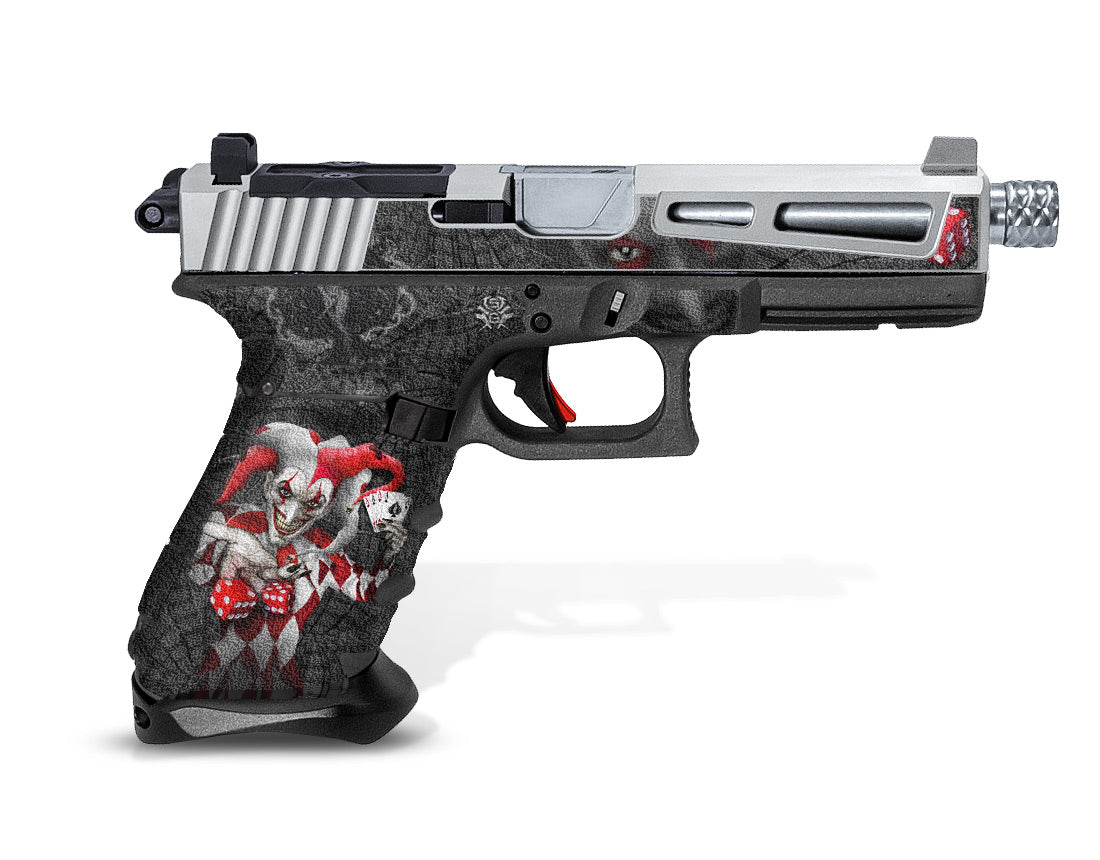 Decal Grip  for Gen 4 Glock 31 – The Joker design by Invision Artworks. Features a textured, rubber-like grip surface to give you a better grip and more control of your firearm. Cover just the frame or add grip and design to the slide of your G17 as well.