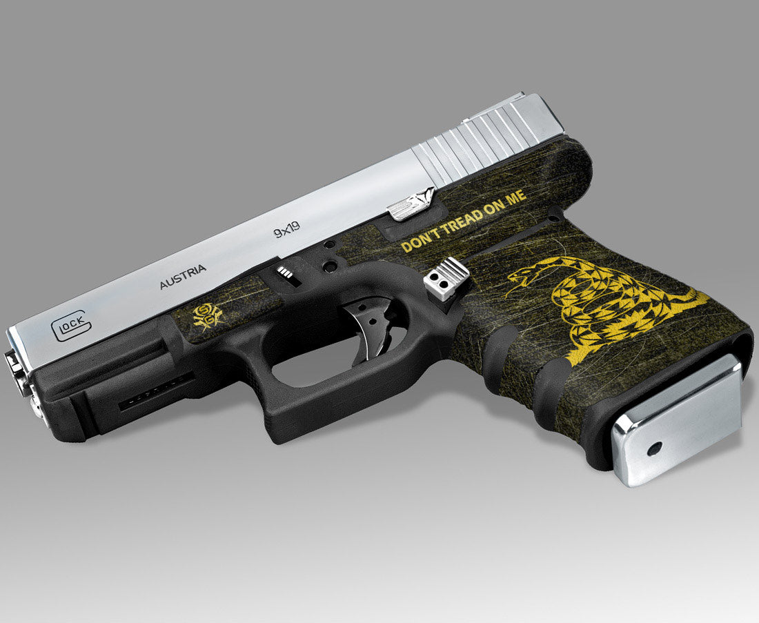 Don’t Tread on Me Grip Graphics for Gen-3 Glock 32. Features a textured, rubber-like surface to give you a better grip and more control of your firearm. Cover just the frame of your G32 or add grip and design to the slide as well. Easy, do-it-yourself installation.