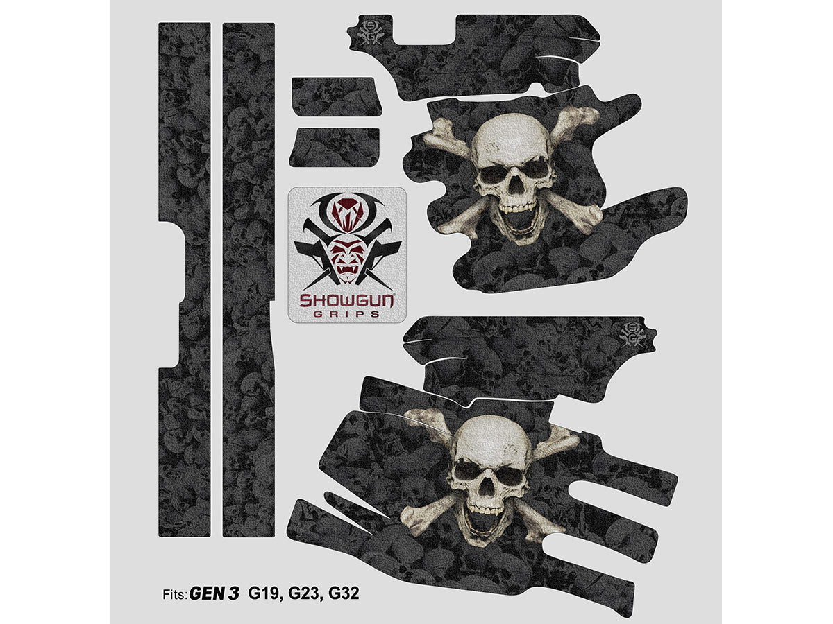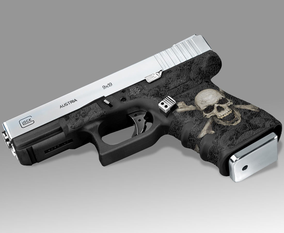 Decal Grip for Gen 3, Glock 32 – Skull & Crossbones – Features a textured, rubber-like grip surface to give you a better grip and more control of your firearm. Cover just the frame or add grip and style to the slide as well.