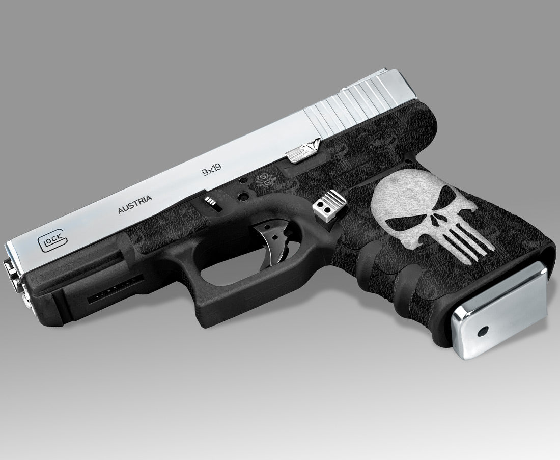 The Punisher Decal Grip Kit for Glock 32 – Features a textured, rubber-like grip surface to give you a better grip and more control of your firearm. Easy, do-it-yourself installation. Cover just the frame or add grip and design to the slide of your Gen 3 G32 also.