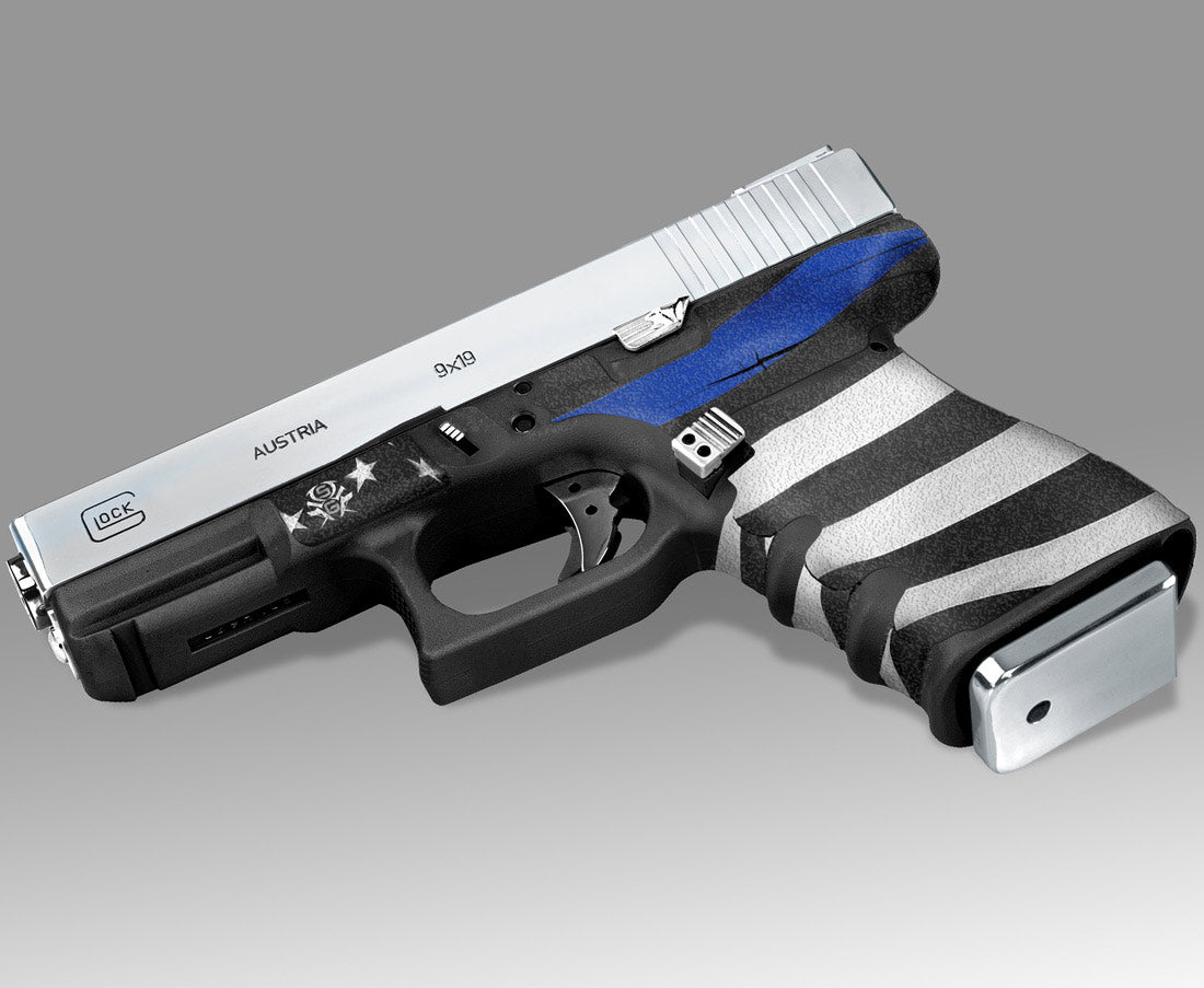 Decal Grip for Glock 32, Gen 3 – Thin Blue Line design. Features a textured, rubber-like surface to give you a better grip and more control of the firearm. Cover just the frame of your G32 or add grip to the slide as well. Easy, do-it-yourself installation.