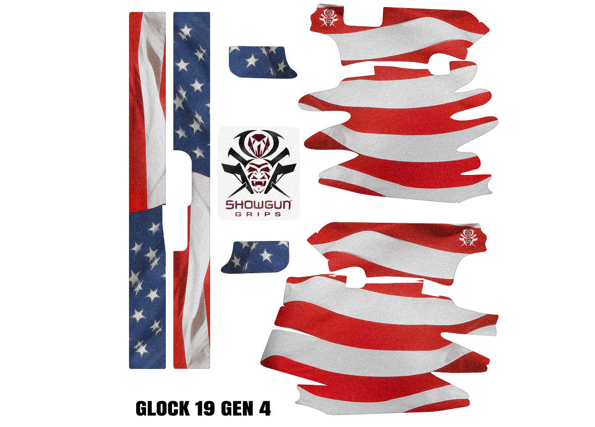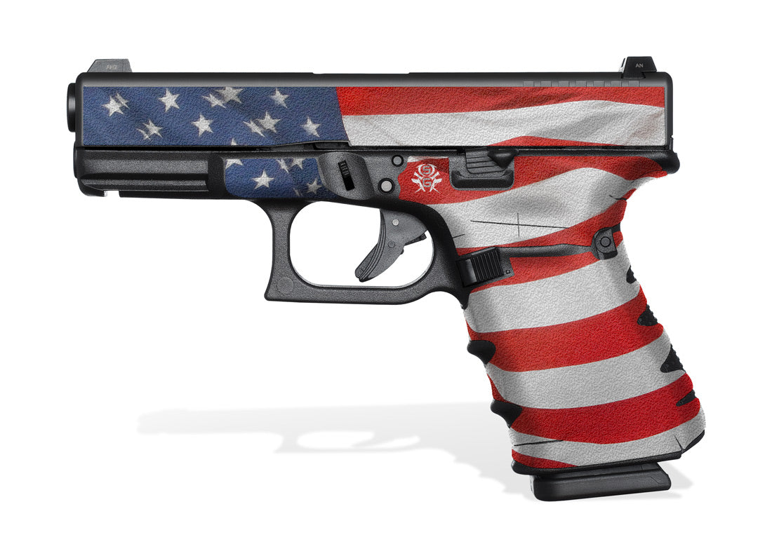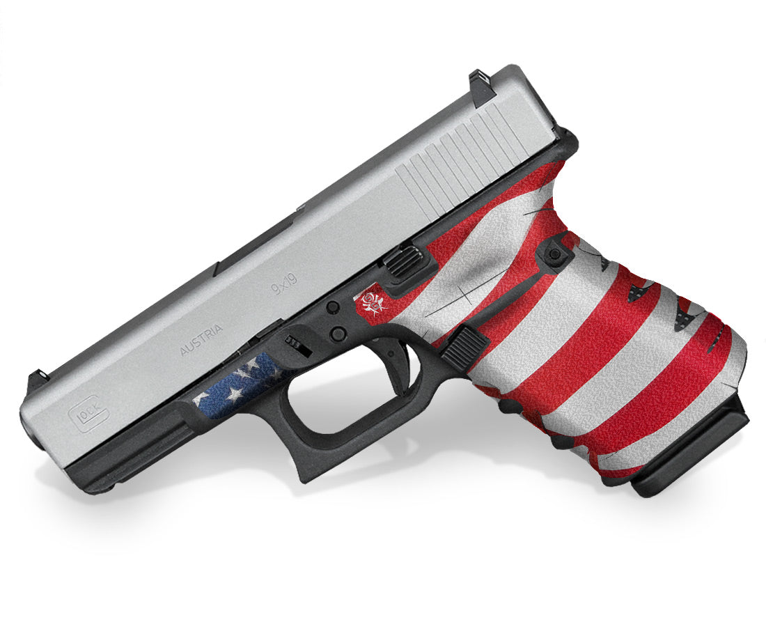 Grip graphics kit for Gen 4 G32 – Stars & Stripes design. Features a textured, rubber-like surface to give you a better grip and more control of the firearm. Cover just the frame or add grip and design to the slide of your Glock 32 as well. Easy, do-it-yourself installation.
