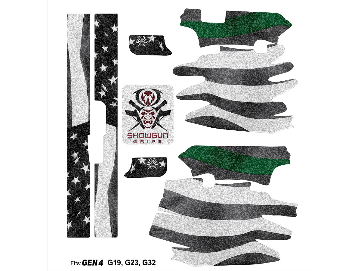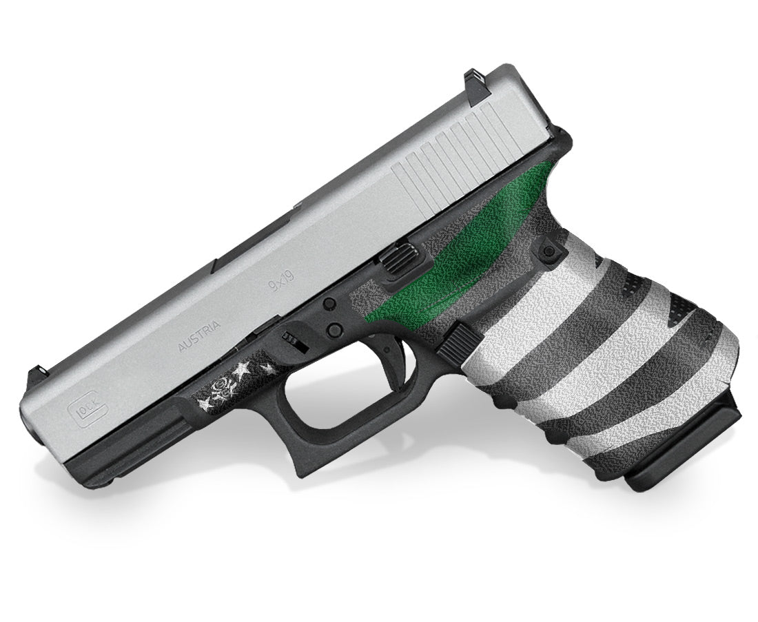 Decal Grip for Gen 4 Glock 32 – Thin Green Line design. Features a textured, rubber-like surface to give you a better grip and more control of the firearm. Cover just the frame of your G32 or add grip and design to the slide as well.