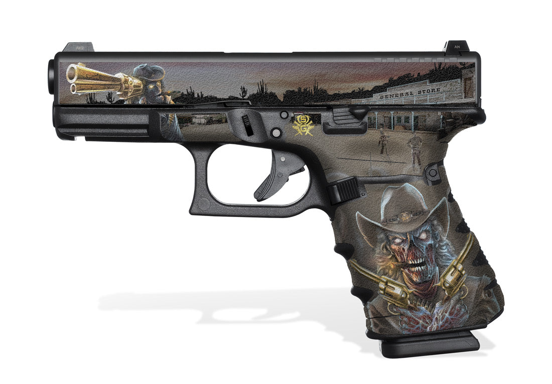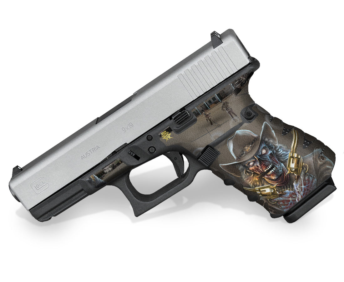 Decal Grip for Glock 32 Gen 4 – Zombie Outlaw design by Invision Artworks. Features a textured, rubber-like surface to give you a better grip and more control of your Glock. Easy, do-it-yourself installation. Cover just the frame of your G32 or add grip and design to the slide  as well.