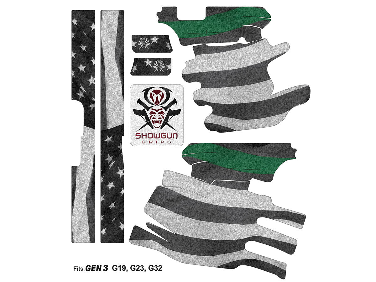 Decal Grip for Gen 3 Glock 32 – Thin Green Line design. Features a textured, rubber-like surface to give you a better grip and more control of the firearm. Cover just the frame of your G32 or add grip and style to your slide as well.