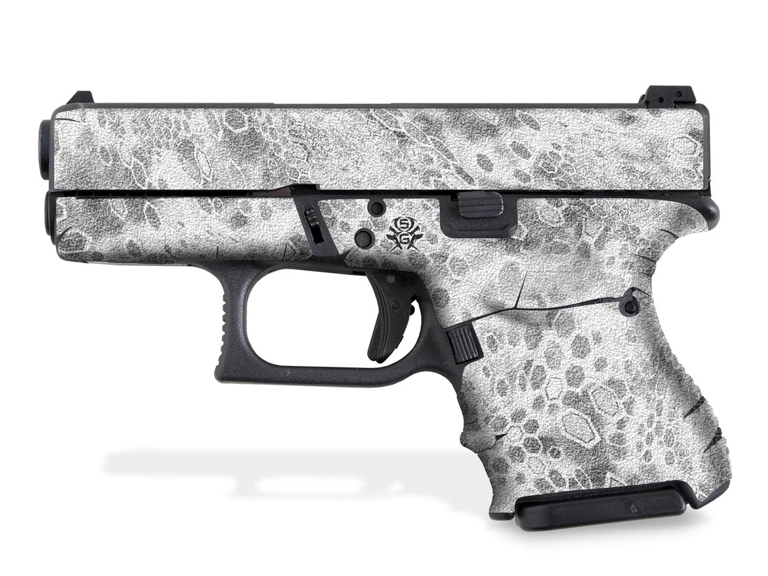Decal Grip Kit for G33 Gen 3 or Gen 4 – Cryptic Camo design. Provides a better grip on the short frame of the Glock 33, giving you more control. Features a textured, rubber-like grip surface. Cover just the frame or add grip the slide as well.