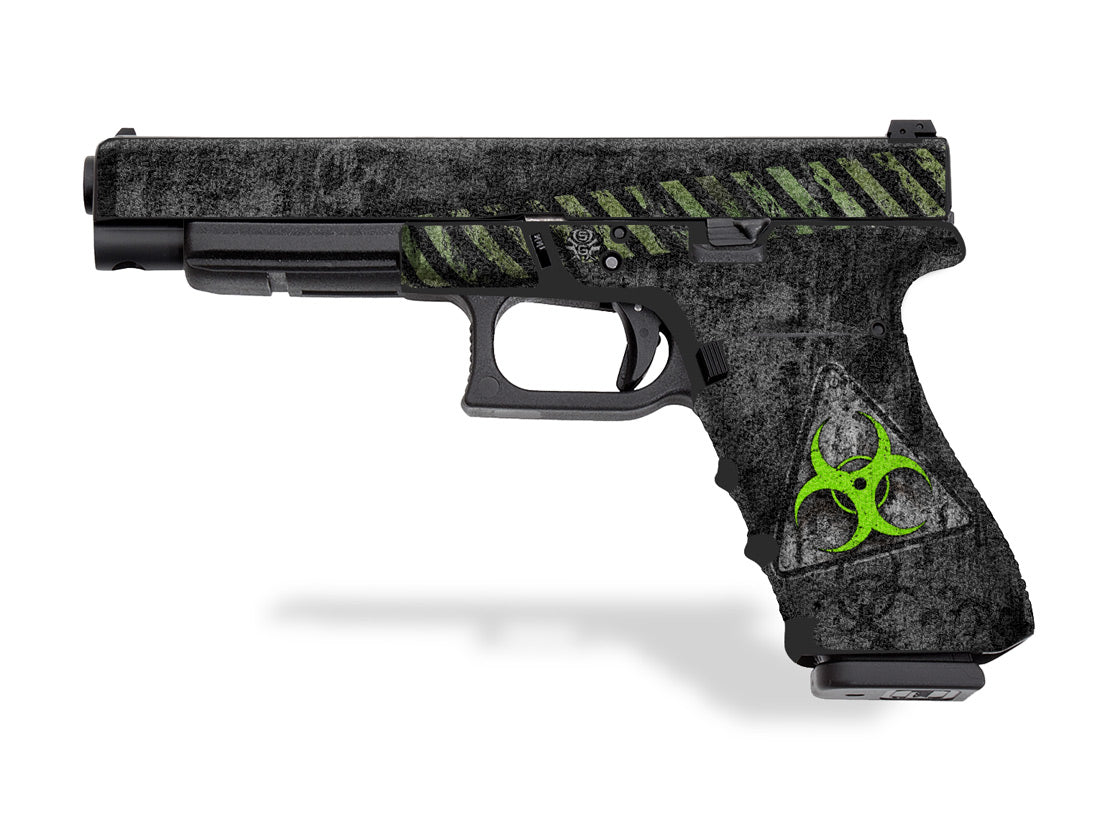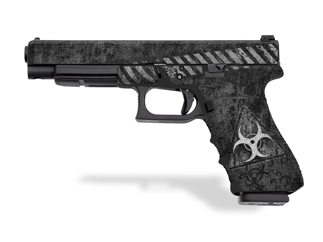 Biohazard design. Features a textured, rubberized grip surface. Cover just the frame or add grip the slide as well.