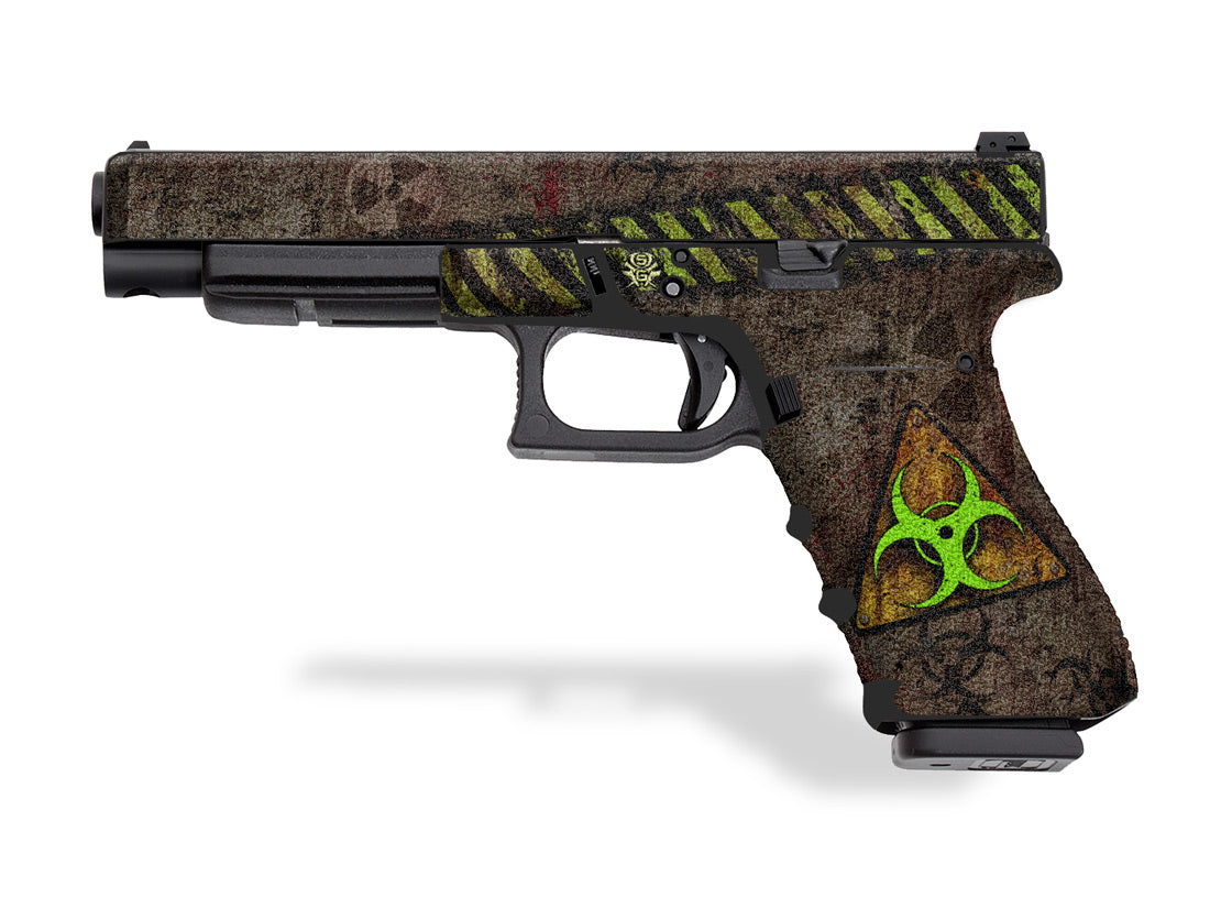 Biohazard design. Features a textured, rubber-like grip surface. Cover just the frame or add grip the slide as well. Provides a better grip, giving you more control.