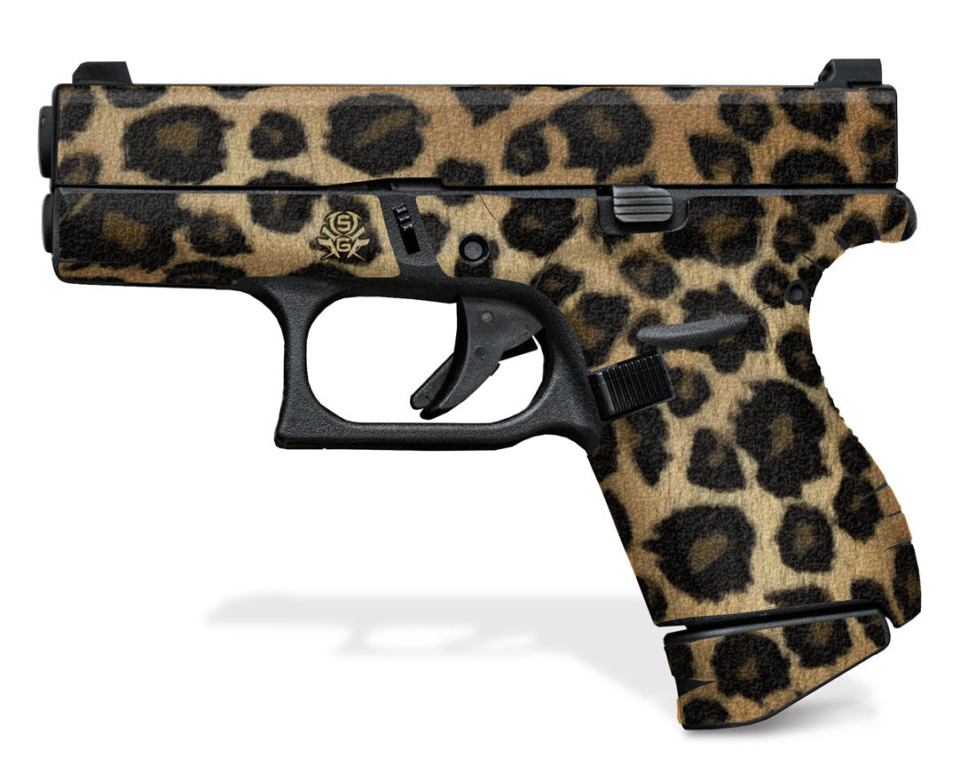 Showgun Tactical Decal Grip for Glock 42 – Features a slightly tacky, rubber-like, textured grip surface to give you better grip and more control of the G42 small frame.  Includes trim-to-fit decals to cover factory base plate, extended base plate or aftermarket magazine extension. Leopard Print design.