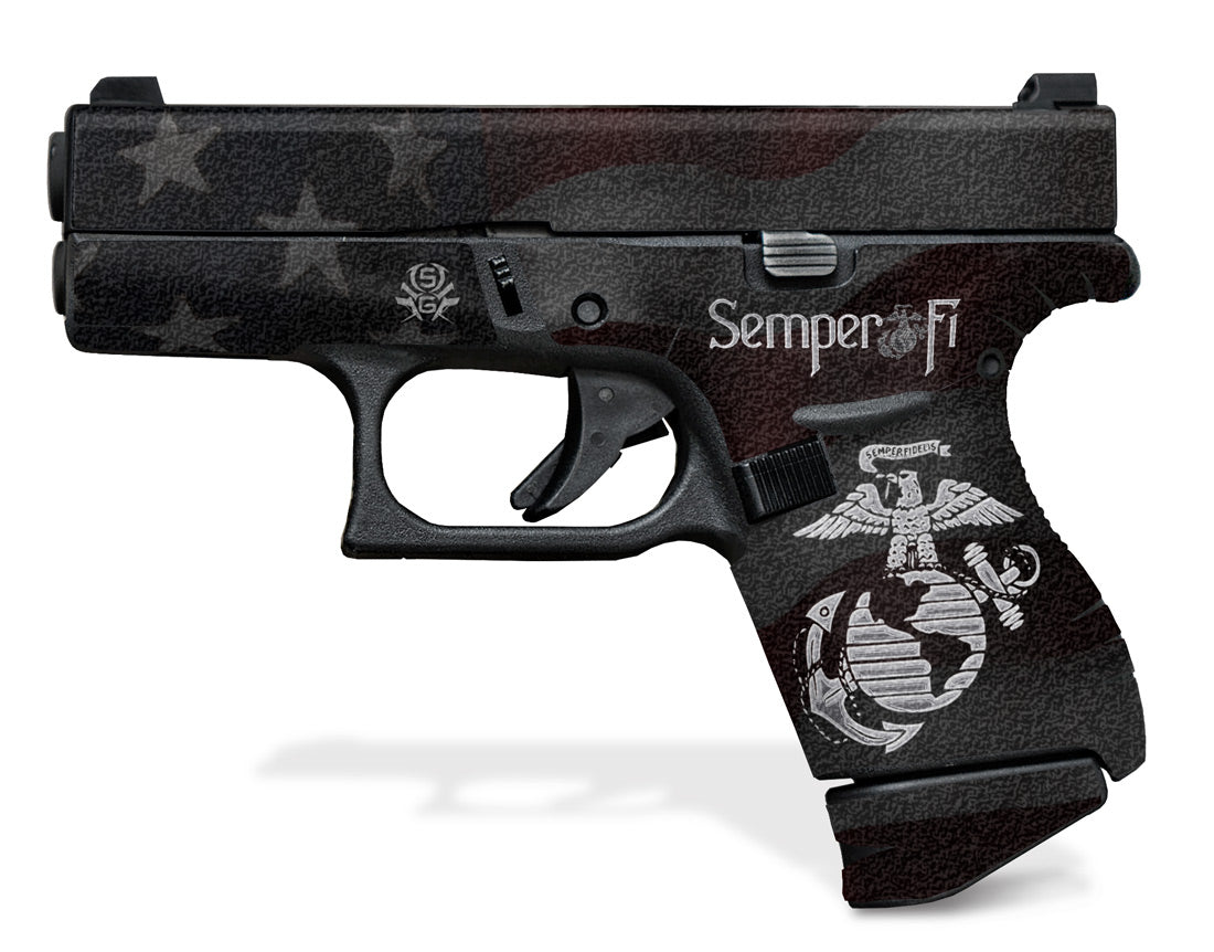 Showgun Tactical Decal Grip for Glock 42 – Features a slightly tacky, rubber-like, textured grip surface to give you better grip and more control of the G42 small frame.  Includes trim-to-fit decals to cover factory base plate, extended base plate or aftermarket magazine extension. Semper Fi design.