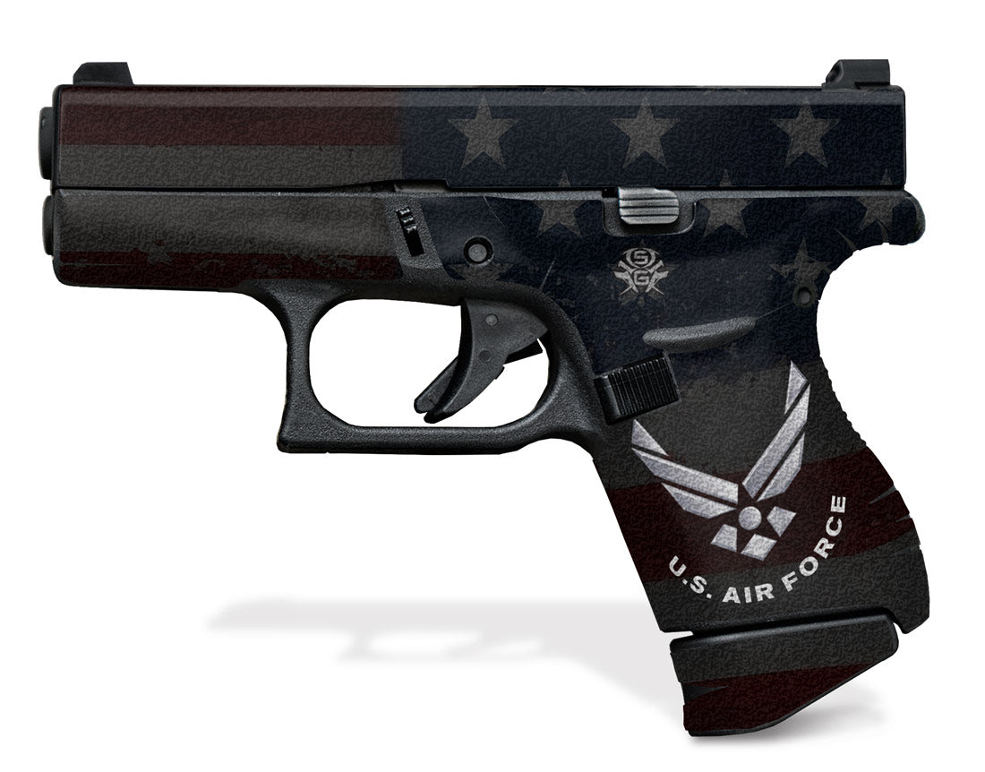 Showgun Decal Grip for Glock 42 – Features an amazing rubberized, textured grip surface to give you a better hold of the small frame of the G42.  Includes trim-to-fit decals to cover factory base plate, extended base plate or aftermarket magazine extension. US Air Force design.
