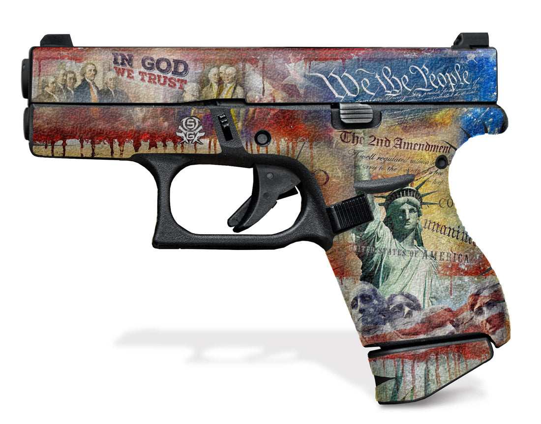 Showgun Decal Grip for Glock 42 – Features a slightly tacky, rubberized, textured grip surface to give you more control and better grip on the  small frame of the G42.  Includes trim-to-fit decals to cover factory base plate, extended base plate or aftermarket magazine extension. We The People design.