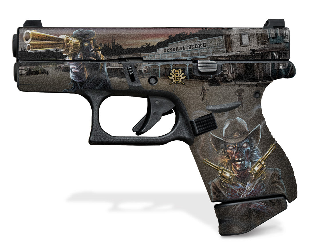 Showgun Tactical Decal Grip for Glock 42 – Features a slightly tacky, rubber-like, textured grip surface to give you better grip and more control of the G42 small frame.  Includes trim-to-fit decals to cover factory base plate, extended base plate or aftermarket magazine extension. Zombie Outlaw design.