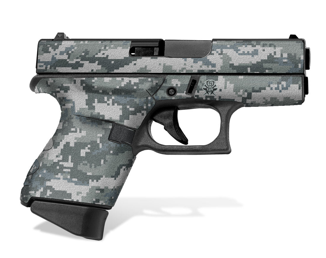 Decal Grip for Glock 43 – Digital Camo design. Features a textured, rubber-like surface to give you a better grip and more control of your firearm. Cover just the frame of your G43 or add grip and design to the slide as well. Easy, do-it-yourself installation.