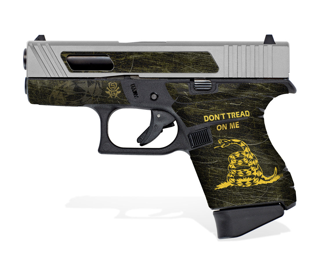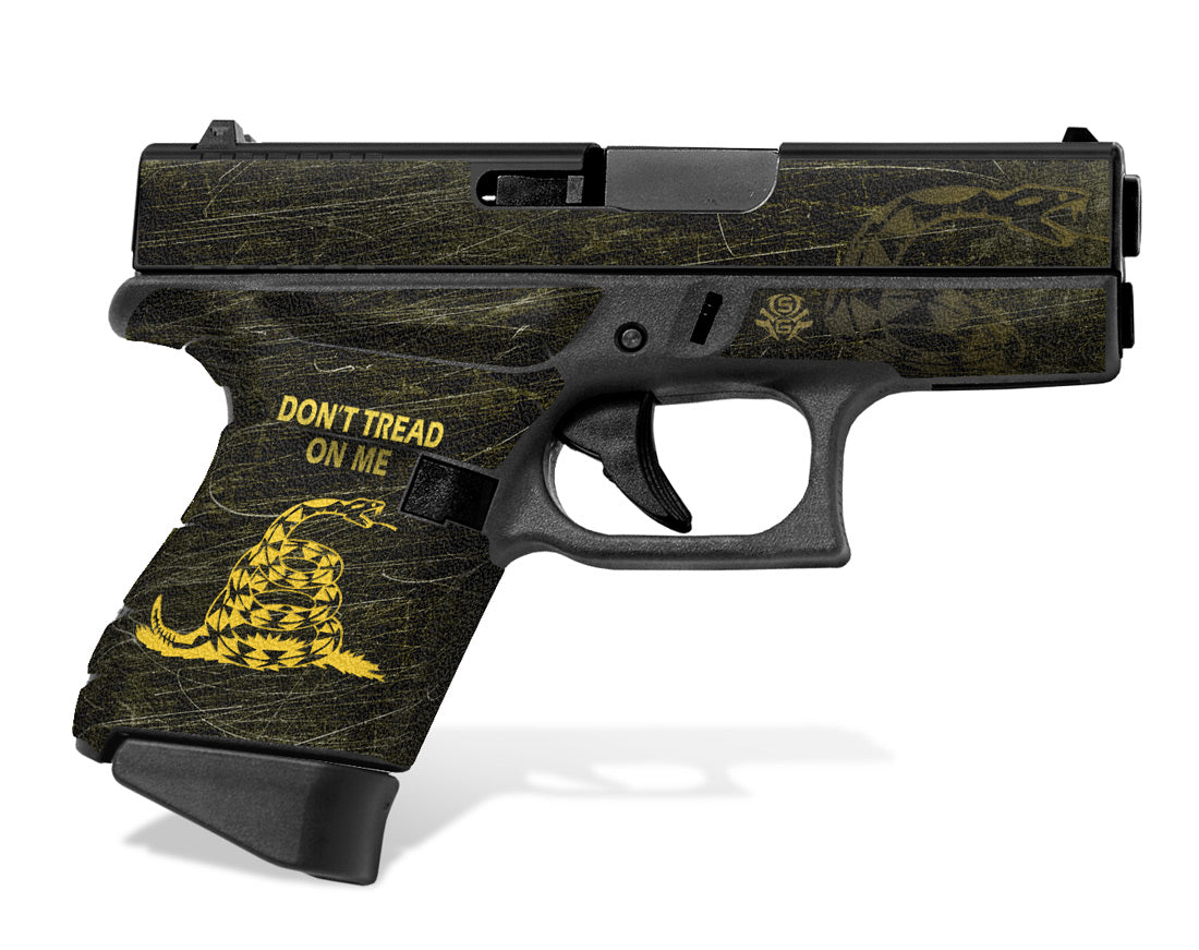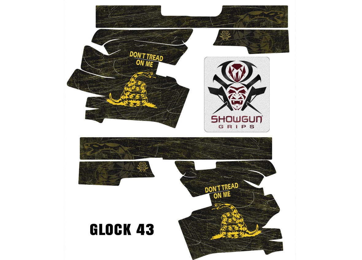 Decal Grip for Glock 43 – Don’t Tread On Me design by Showgun Grips. Features a textured, rubber-like surface to give you a better grip and more control of your firearm. Cover just the frame of your G43 or add grip to the slide as well.