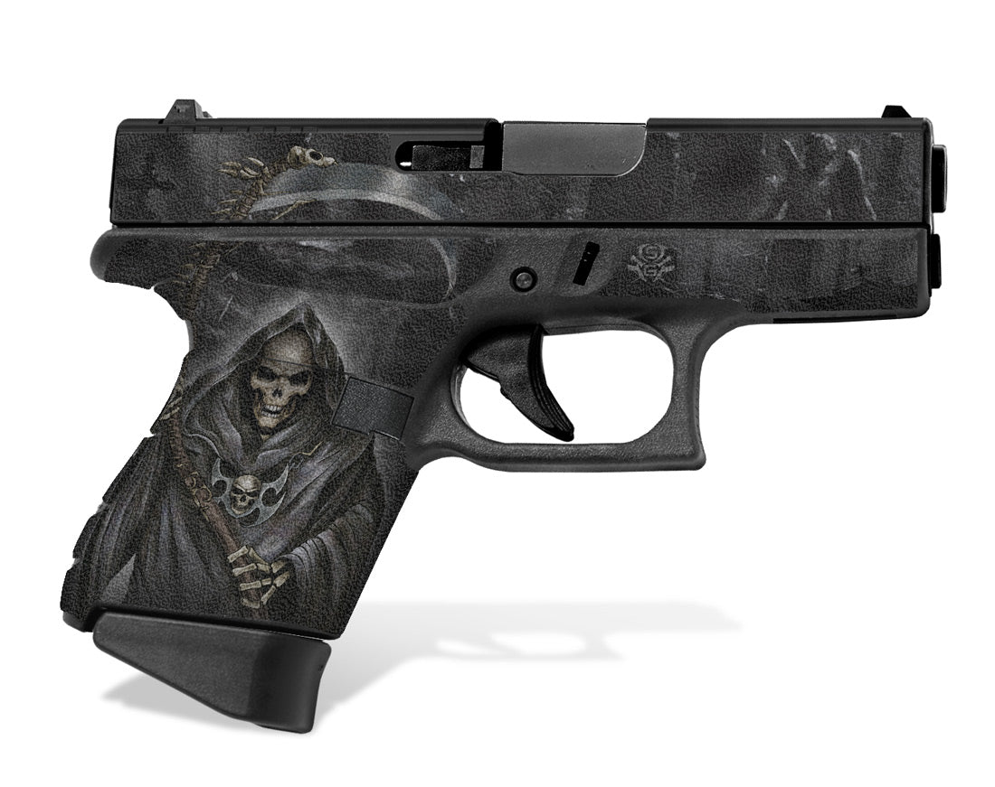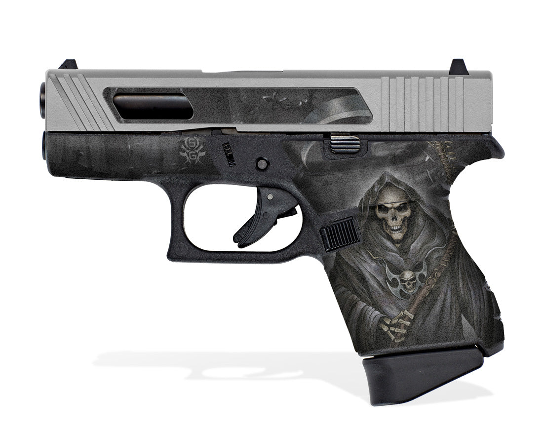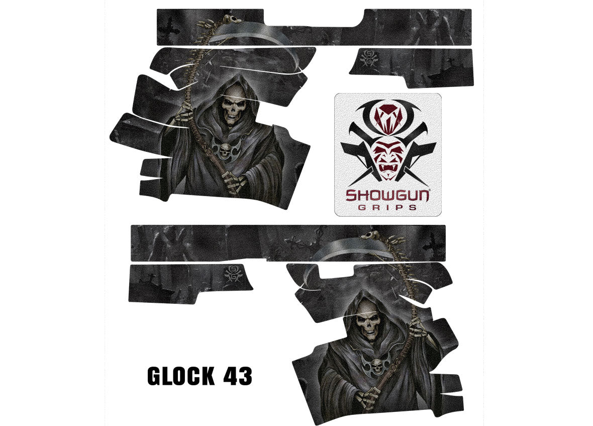 Decal Grip for Glock 43 – Grim Reaper. Features a textured, rubberized surface to give you a better grip and more control. Cover just the frame of your G43 or add grip and design to the slide as well. Easy, do-it-yourself installation.