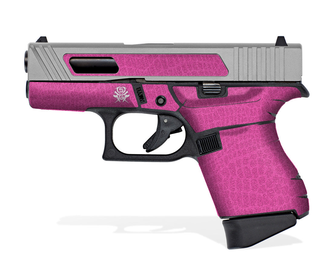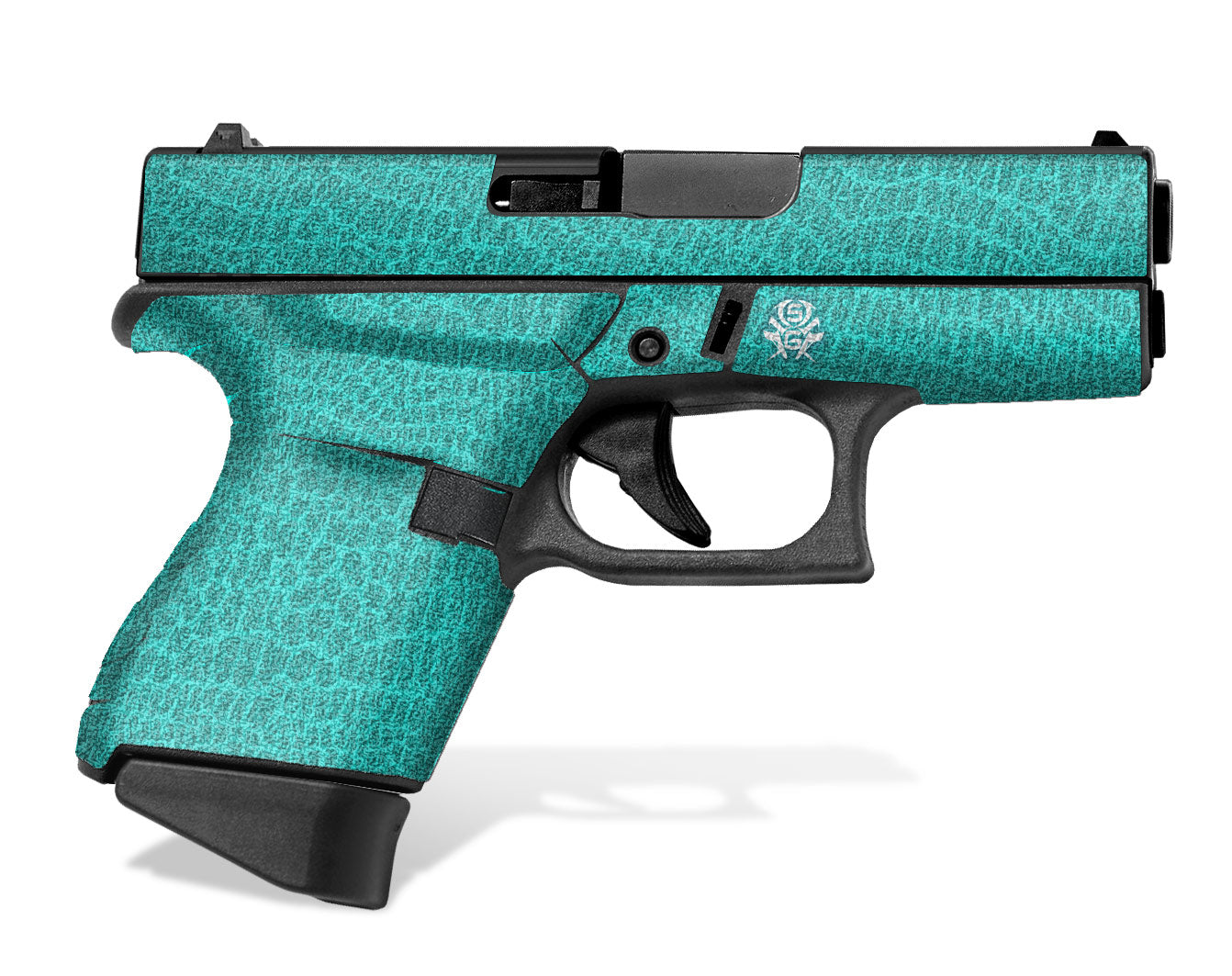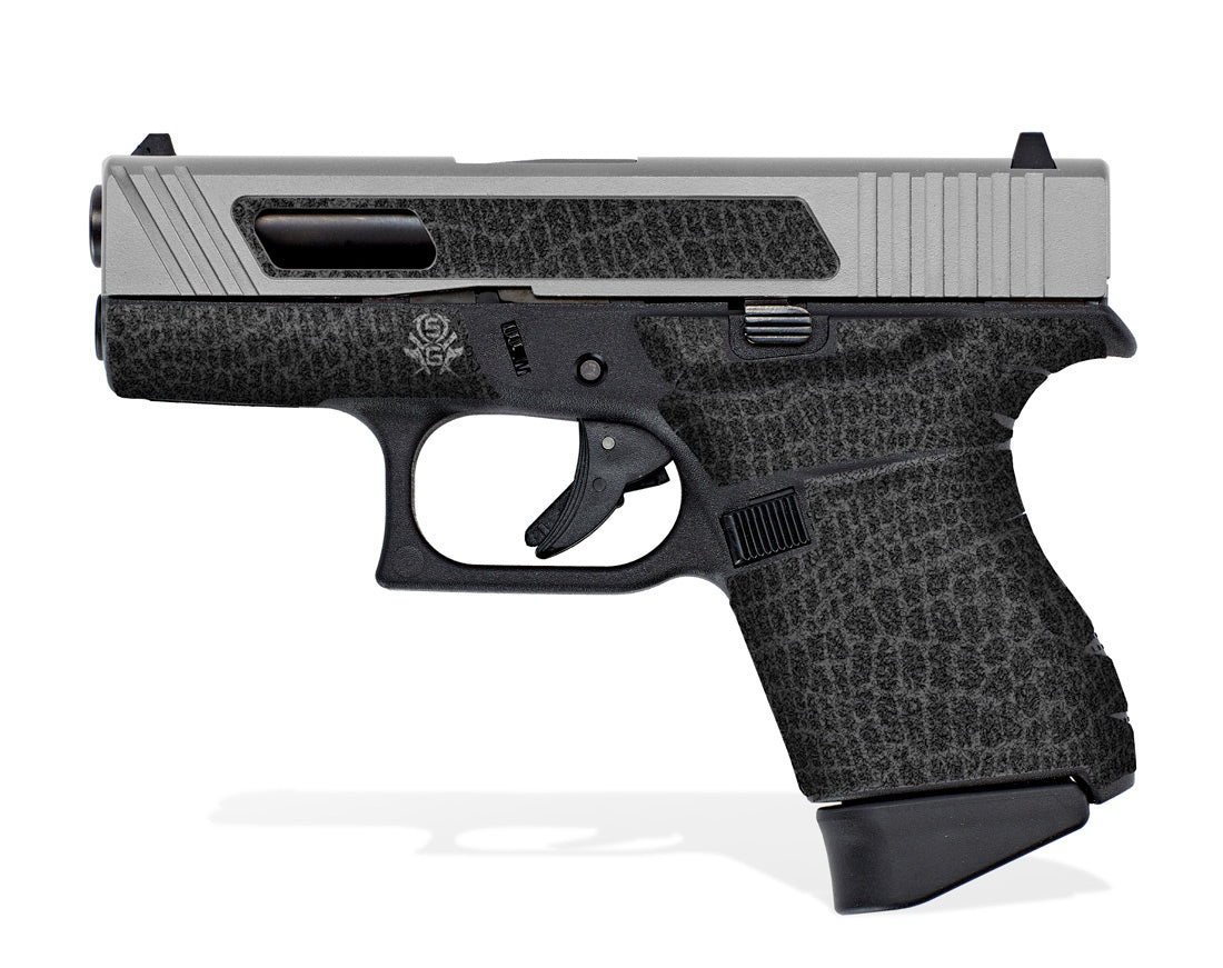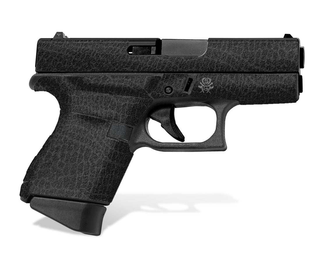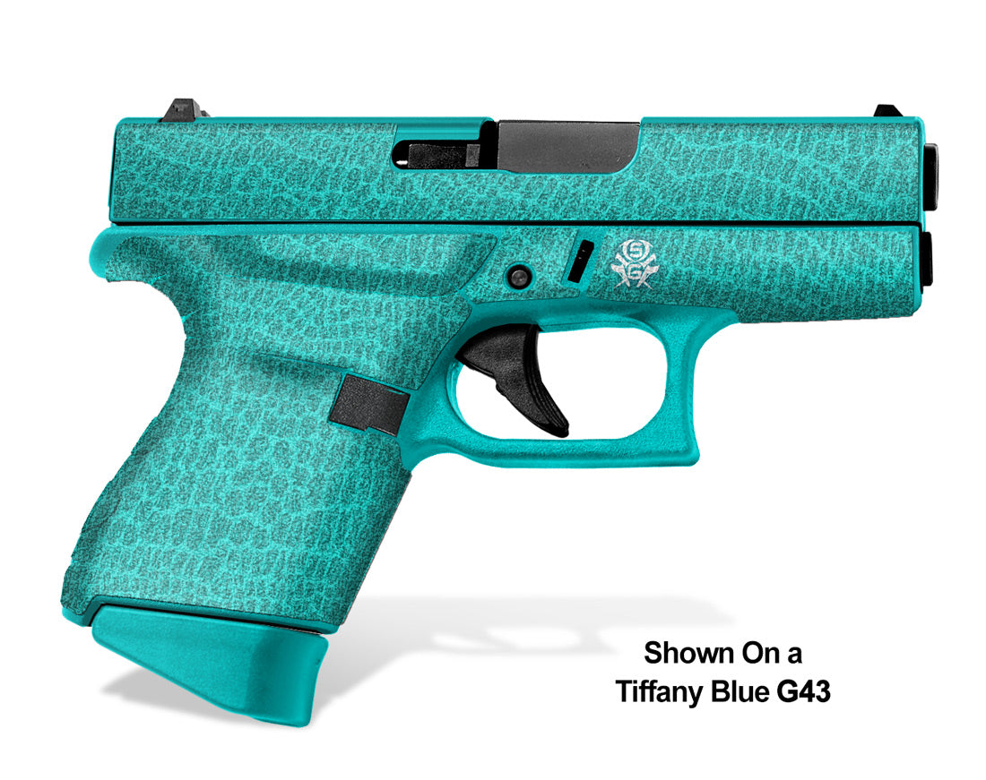 Decal Grip Kit for Glock 43 – Reptilian. Features a textured, rubber-like surface to give you a better grip and more control of your firearm. Cover just the frame of your G43 or add grip and design to the slide as well. Easy, do-it-yourself installation.