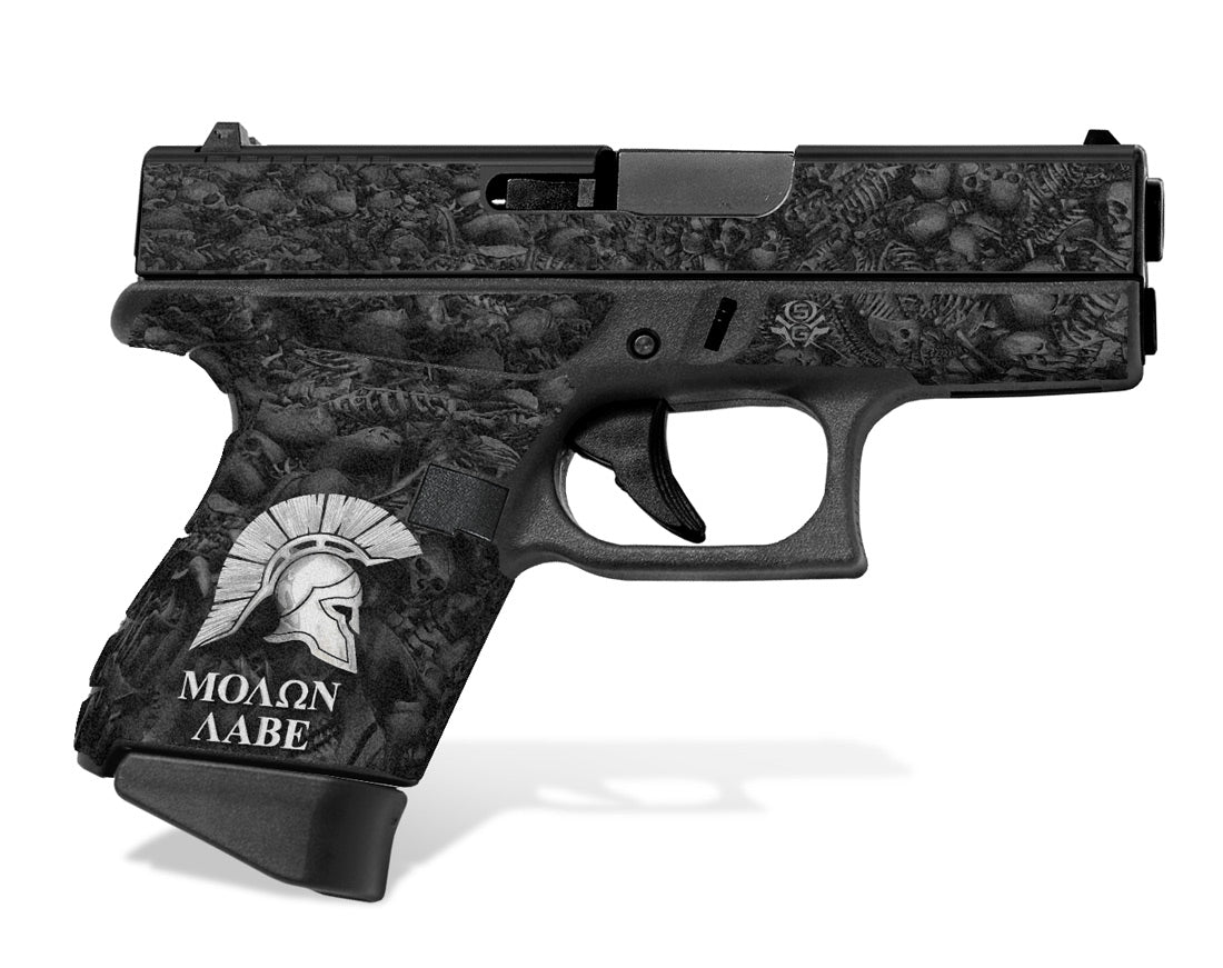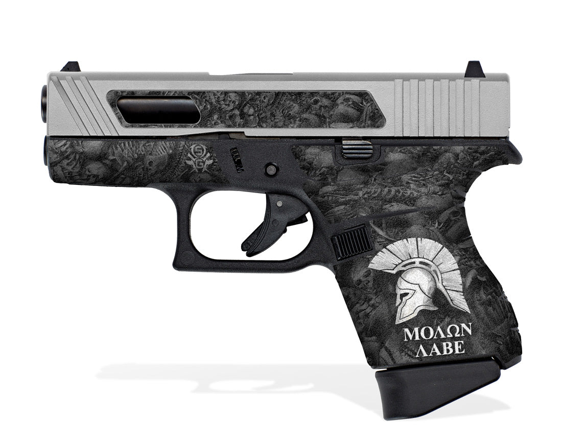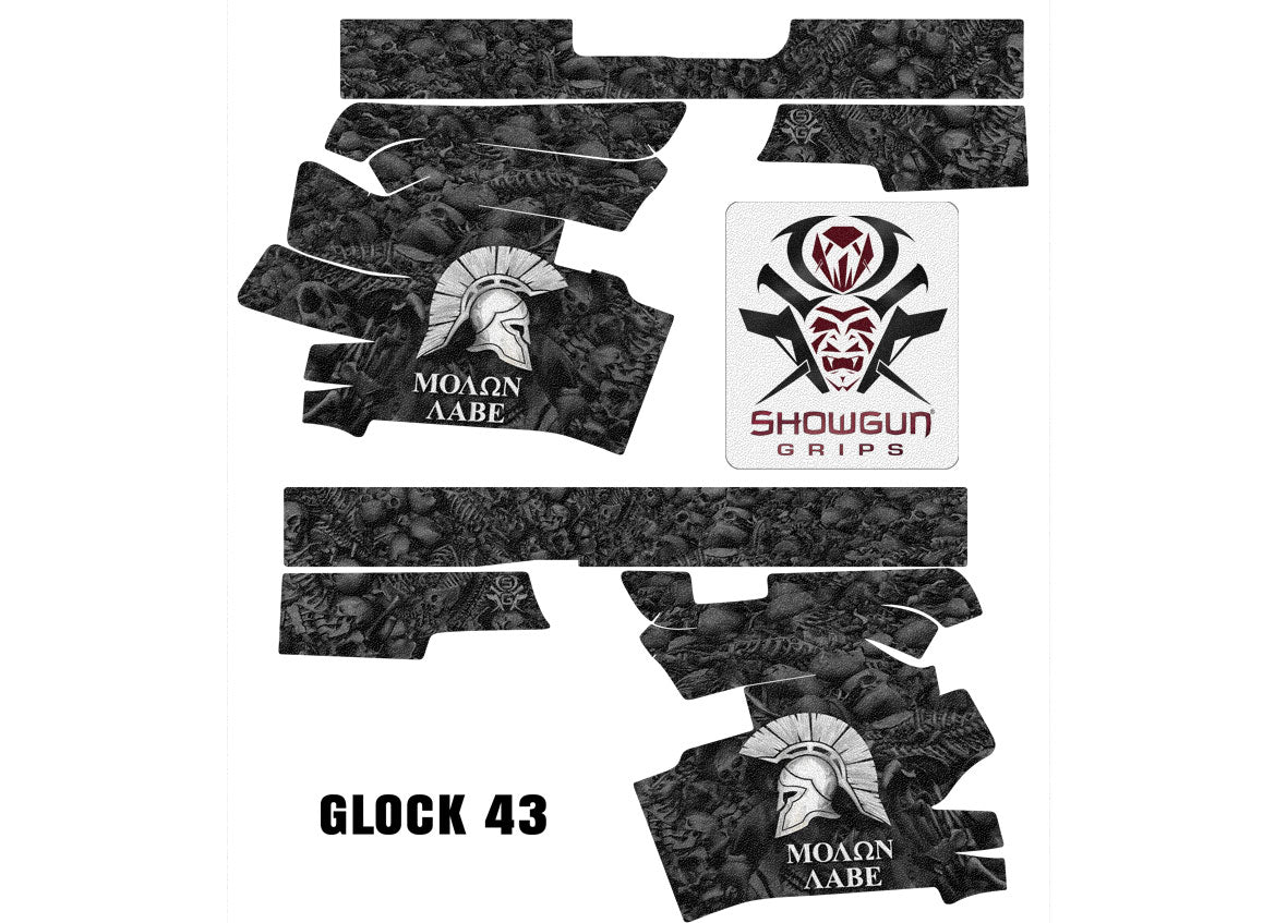 Decal Grip for Glock 43 – Sparta / Molon Labe design by Showgun Grips. Features a textured, rubber-like surface to give you a better grip and more control of your G43. Cover just the frame or add grip and design to the slide as well.