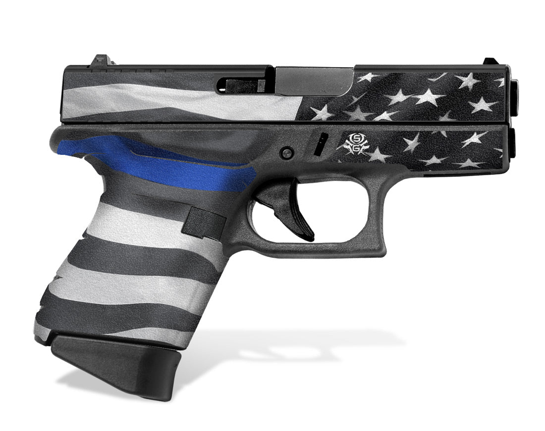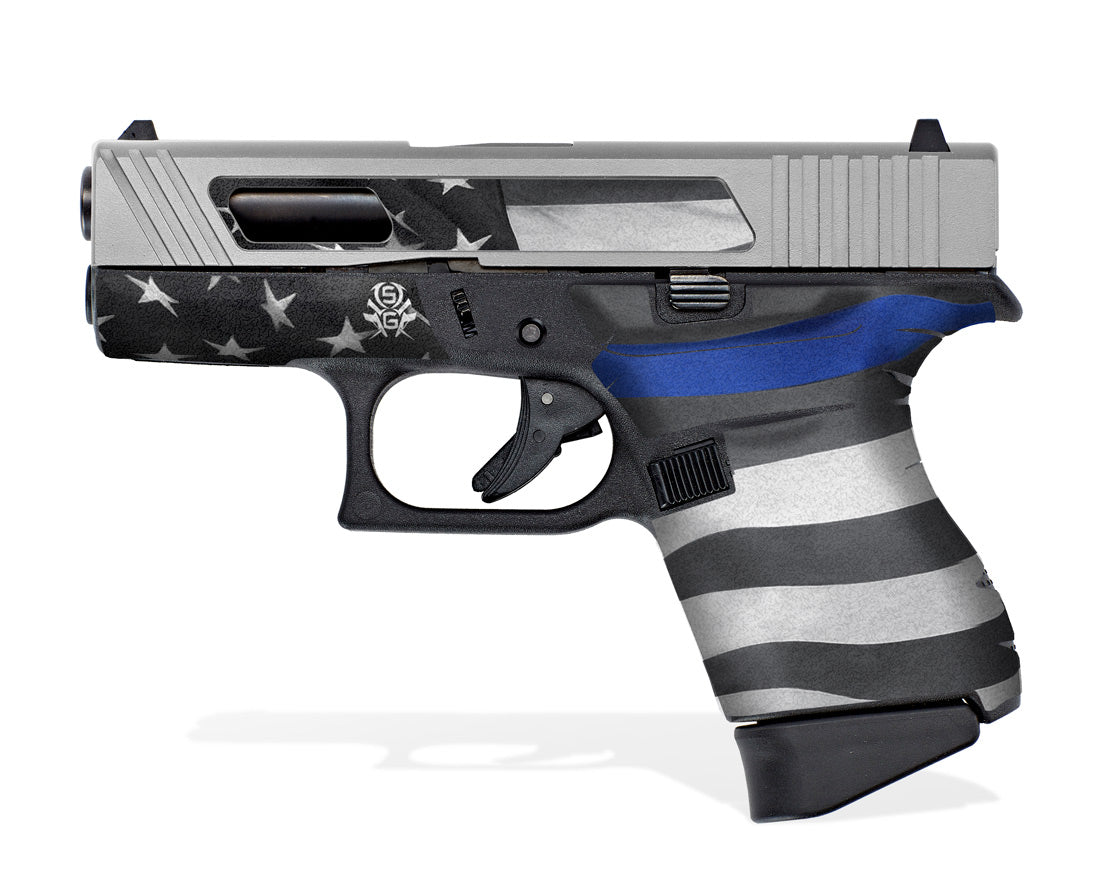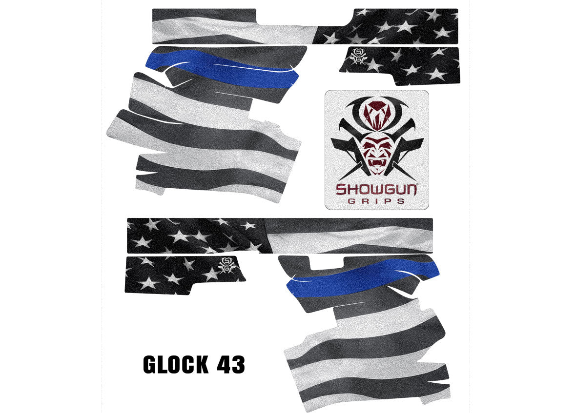 Tactical Grip for Glock 43 – Thin Blue Line design. Cover just the frame or add grip to the slide of your G43 as well. Features a textured, rubber-like surface to give you a better grip and more control.
