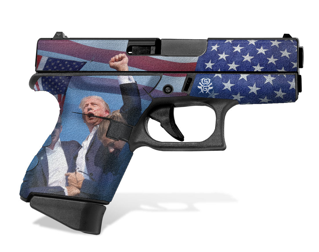 Tactical Decal Grip for Glock 43 – Trump Fight, Fight, Fight! 2024 design. Features a textured, rubber-like surface to give you a better grip and more control. Cover just the frame of your 43 or add grip to the slide as well.