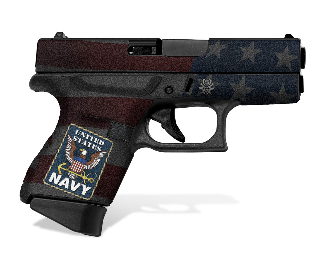 Decal Grip for Glock 43 – US Navy design. Features a textured, rubber-like surface to give you a better grip and more control of your firearm. Cover just the frame of your G43 or add grip and design to the slide as well. Easy, do-it-yourself installation.