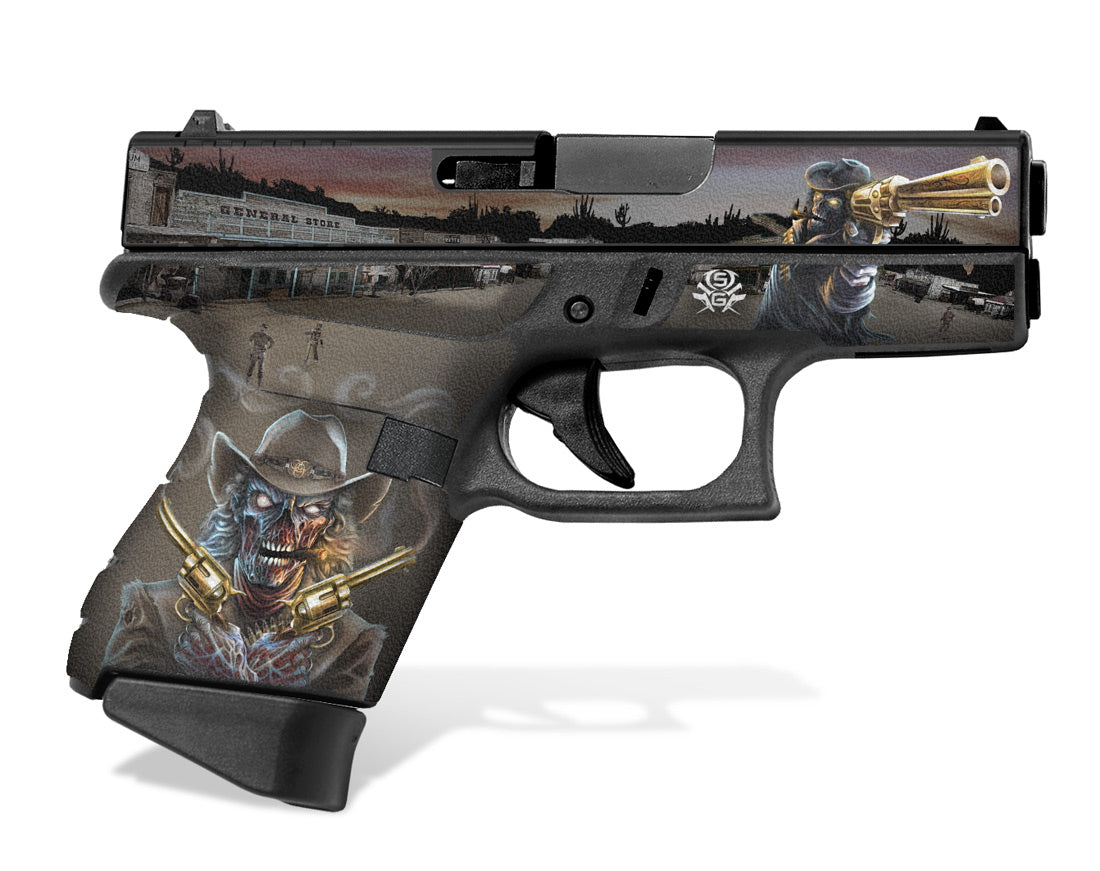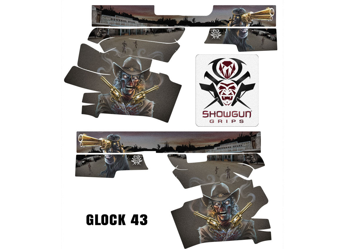 Decal Grip for Glock 43 – Zombie Outlaw design by Invision Artworks. Features a textured, rubber-like surface to give you a better grip and more control of your firearm. Cover just the frame of your G43 or add grip and design to the slide as well.