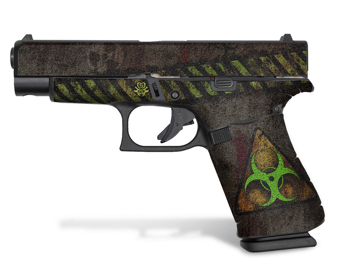 Decal Decal Grip Kit for Glock 48 – Biohazard design. Features a textured, rubberized surface to give you a better grip and more control of your firearm. Cover just the frame of your G48, or add grip and design to the slide as well. Easy, do-it-yourself installation.