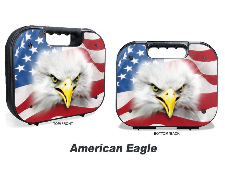 Graphics for your factory Glock case! American Flag with American Eagle. Put a custom look on your Glock case while protecting from scratches. Manufactured with specially formulated adhesive and a thick, UV protective, scratch resistant over-laminate designed to withstand harsh conditions. Easy do-it-yourself installation.