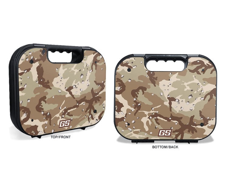 Graphics for your factory Glock case! Desert Camo design. Get a custom look while protecting your Glock Factory case from scratches. Manufactured with a thick, UV protected, scratch resistant over-laminate that holds up in harsh conditions. Easy do-it-yourself installation.
