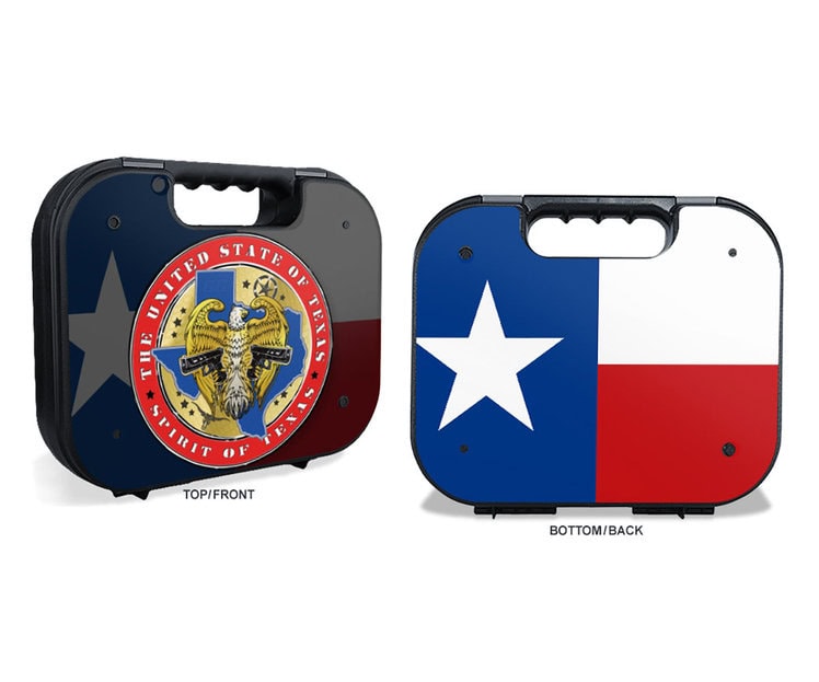 Graphics for your factory Glock case! Spirit of Texas design. Get a custom look while protecting your Glock Factory case from scratches. Manufactured with a thick, UV protected, scratch resistant over-laminate that holds up in harsh conditions. Easy do-it-yourself installation.