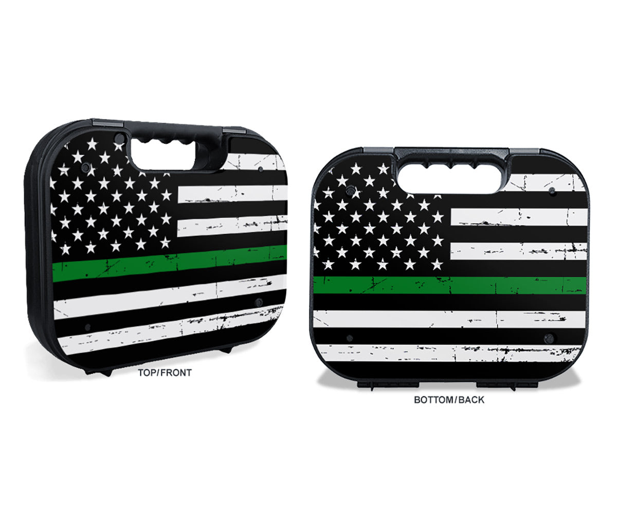 Graphics for your factory Glock case – Thin Green Line design – Support our Border Patrol and Forestry personnel with a custom look on your Glock case while protecting from scratches. Manufactured with specially formulated adhesive and a thick, UV protected, scratch resistant over-laminate designed to withstand harsh conditions. Easy do-it-yourself installation.