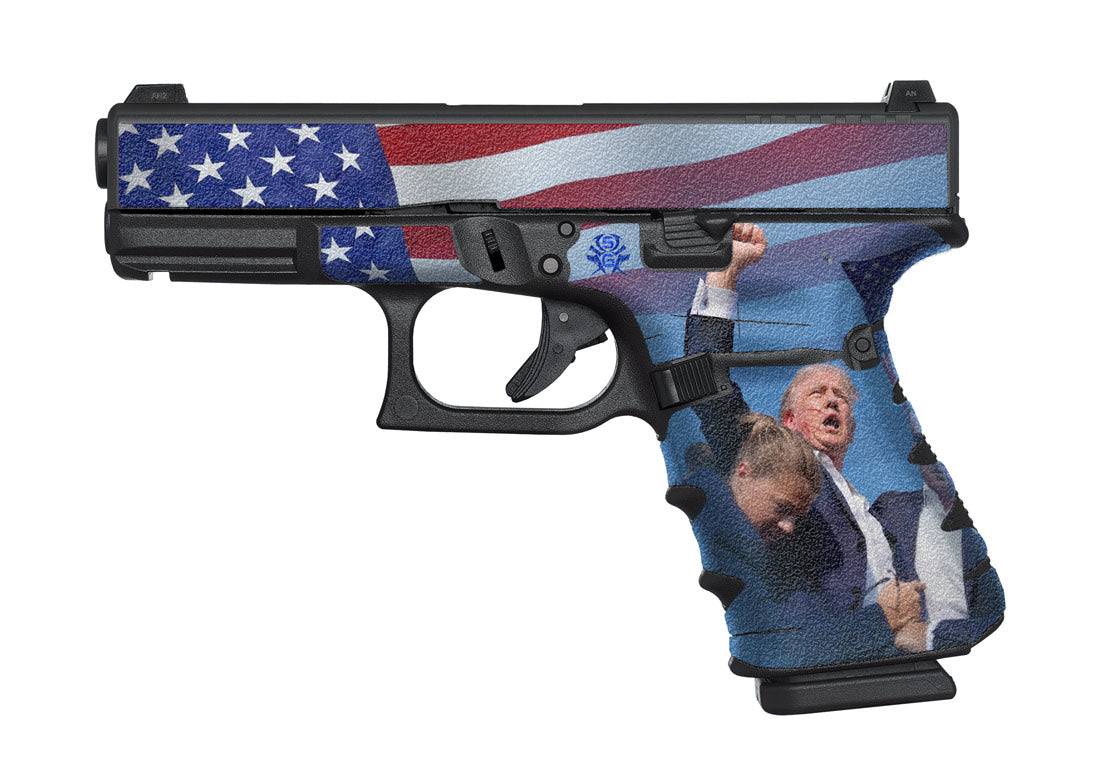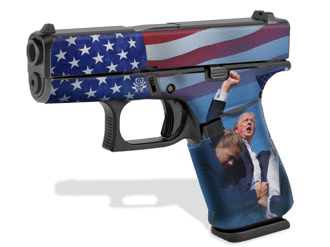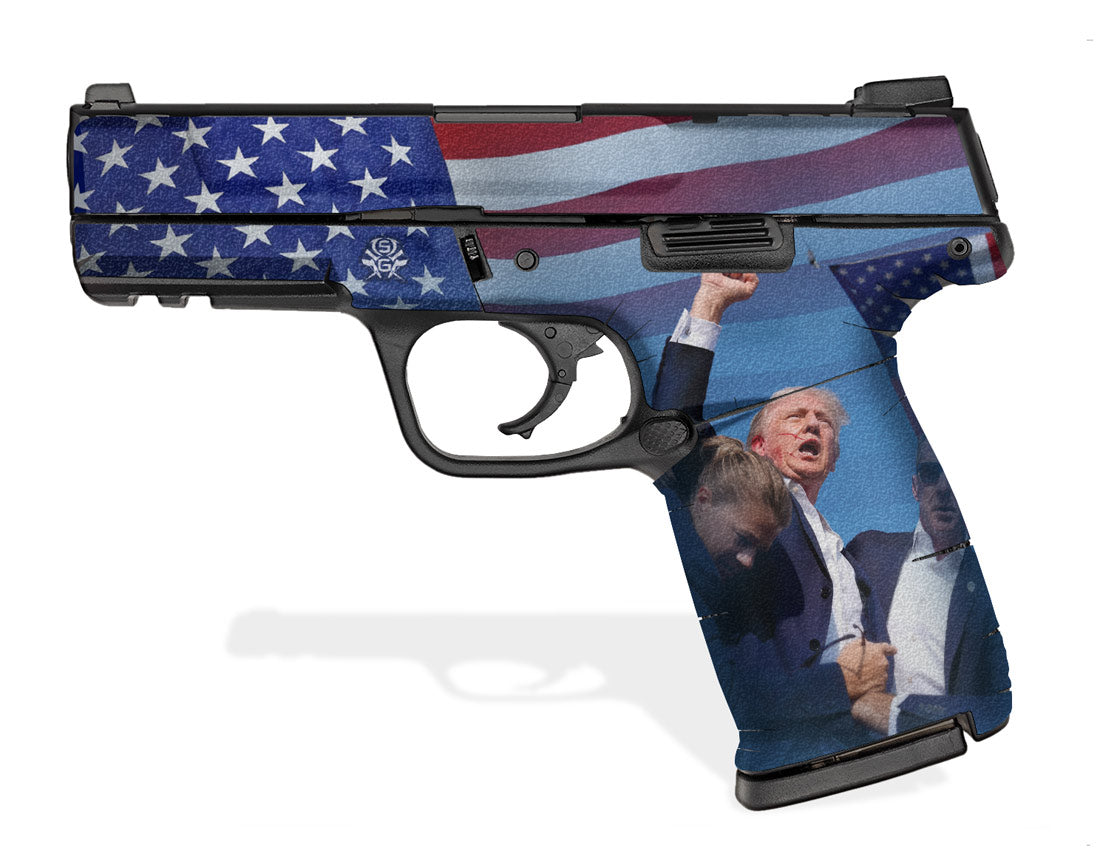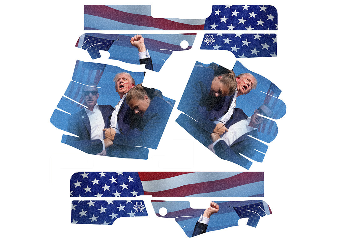 Limited Edition TRUMP Fight, Fight, Fight! 2024 Decal Grip –  Showgun DECAL GRIPs are manufactured with a rubberized, textured vinyl and 3M adhesive specifically formulated to mold into textured surfaces and stay on through harsh conditions. Cover just the frame or apply grip to the slide as well. The rubber-like feel is not only non-slip, but it won’t chaff or irritate your skin. TRUMP 2024 design available here, templated to fit over 40 gun models (see below).