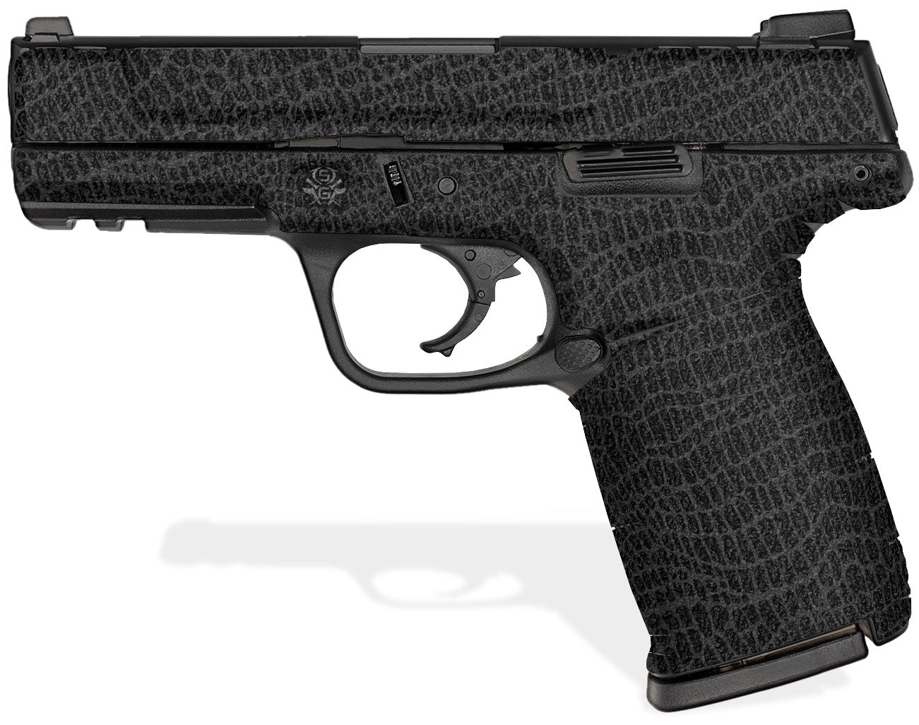 Showgun decal grips are manufactured with a rubberized, textured vinyl, and 3M adhesive specifically formulated to mold into textured surfaces and stay on through harsh environments and conditions. Cover just the frame or apply it to the slide as well. The rubberized feel is not only non-slip, but it won’t chaff or irritate your skin. Reptilian in Black design available here, templated to fit over 40 gun models (see below).