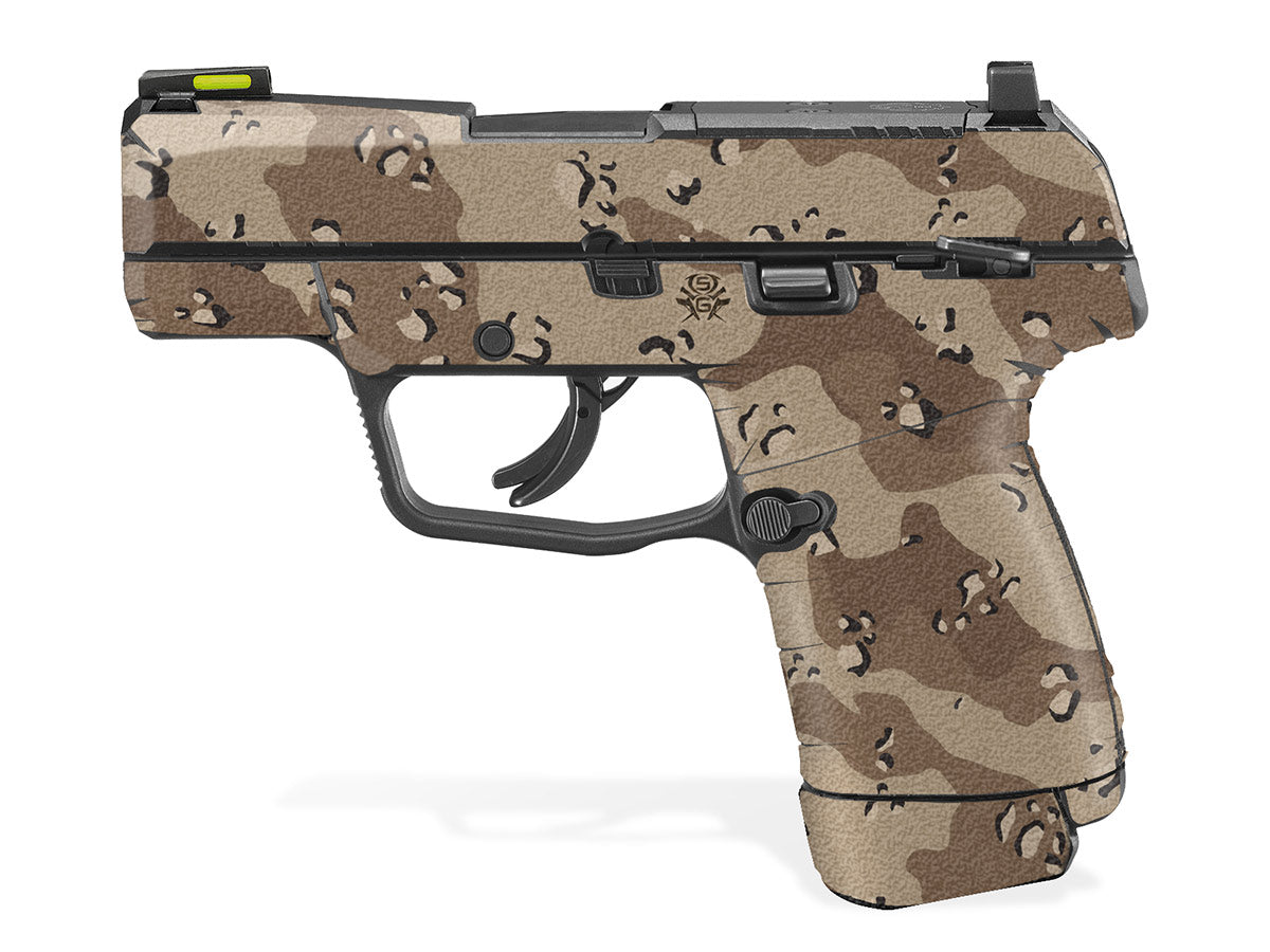 Decal Grip for Ruger Max-9 – Showgun decal grips are manufactured with a rubberized, textured vinyl and specially formulated 3M adhesive, that molds into textured surfaces and stays on through harsh environments and conditions. Cover just the frame of your Ruger Max9 or apply it to the slide as well. The rubber-like feel is not only non-slip, but it won’t chaff or irritate your skin. Desert Camo design.