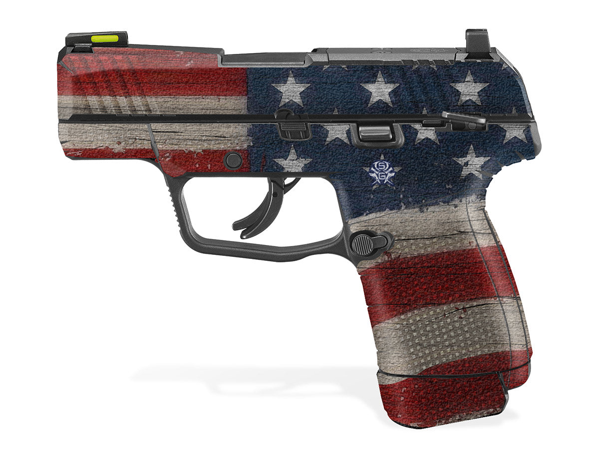 Decal Grip for Ruger Max-9 – Showgun decal grips are manufactured with a rubberized, textured vinyl and specially formulated 3M adhesive, that molds into textured surfaces and stays on through harsh environments and conditions. Cover just the frame of your Ruger Max9 or apply it to the slide as well. The rubber-like feel is not only non-slip, but it won’t chaff or irritate your skin. Old Glory design.