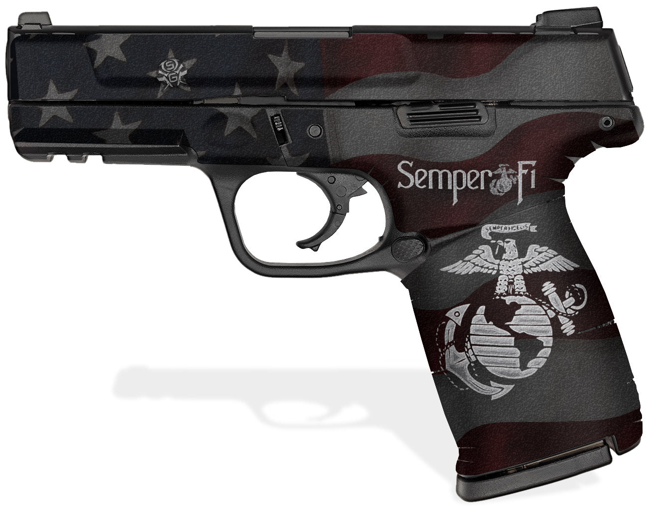 Showgun decal grips are manufactured with a rubberized, textured vinyl, and 3M adhesive specifically formulated to mold into textured surfaces and stay on through harsh environments and conditions. Cover just the frame or apply it to the slide as well. The rubberized feel is not only non-slip, but it won’t chaff or irritate your skin. Semper Fi design available here, templated to fit over 40 gun models (see below).