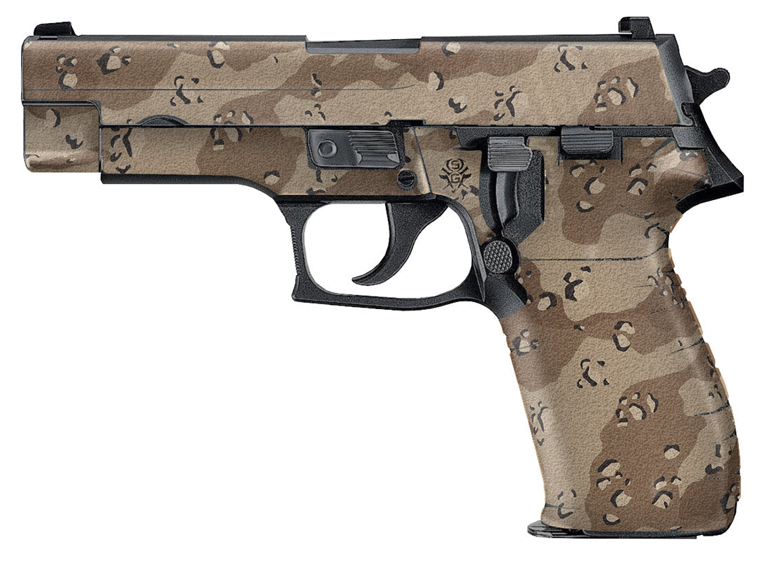 Sig P226 Decal Grip – Manufactured with a rubber-like, textured, non-slip vinyl that gives you a firm secure grip and won’t chaff or irritate your skin. Made with 3M adhesive specially formulated to mold into textured surfaces and stay on through harsh conditions. Desert Camo design.