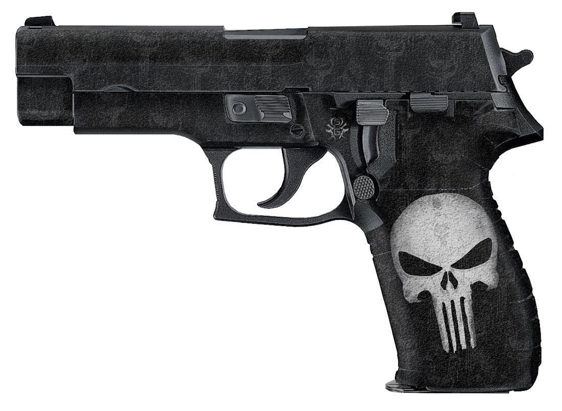 Sig P226 Decal Grip – Manufactured with a rubber-like, textured, non-slip vinyl that gives you a firm secure grip and won’t chaff or irritate your skin. Made with 3M adhesive specially formulated to mold into textured surfaces and stay on through harsh conditions. Punisher design.