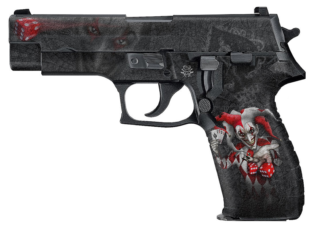 Sig P226 Decal Grip – Manufactured with a rubber-like, textured, non-slip vinyl that gives you a firm secure grip and won’t chaff or irritate your skin. Made with 3M adhesive specially formulated to mold into textured surfaces and stay on through harsh conditions. The Joker design.