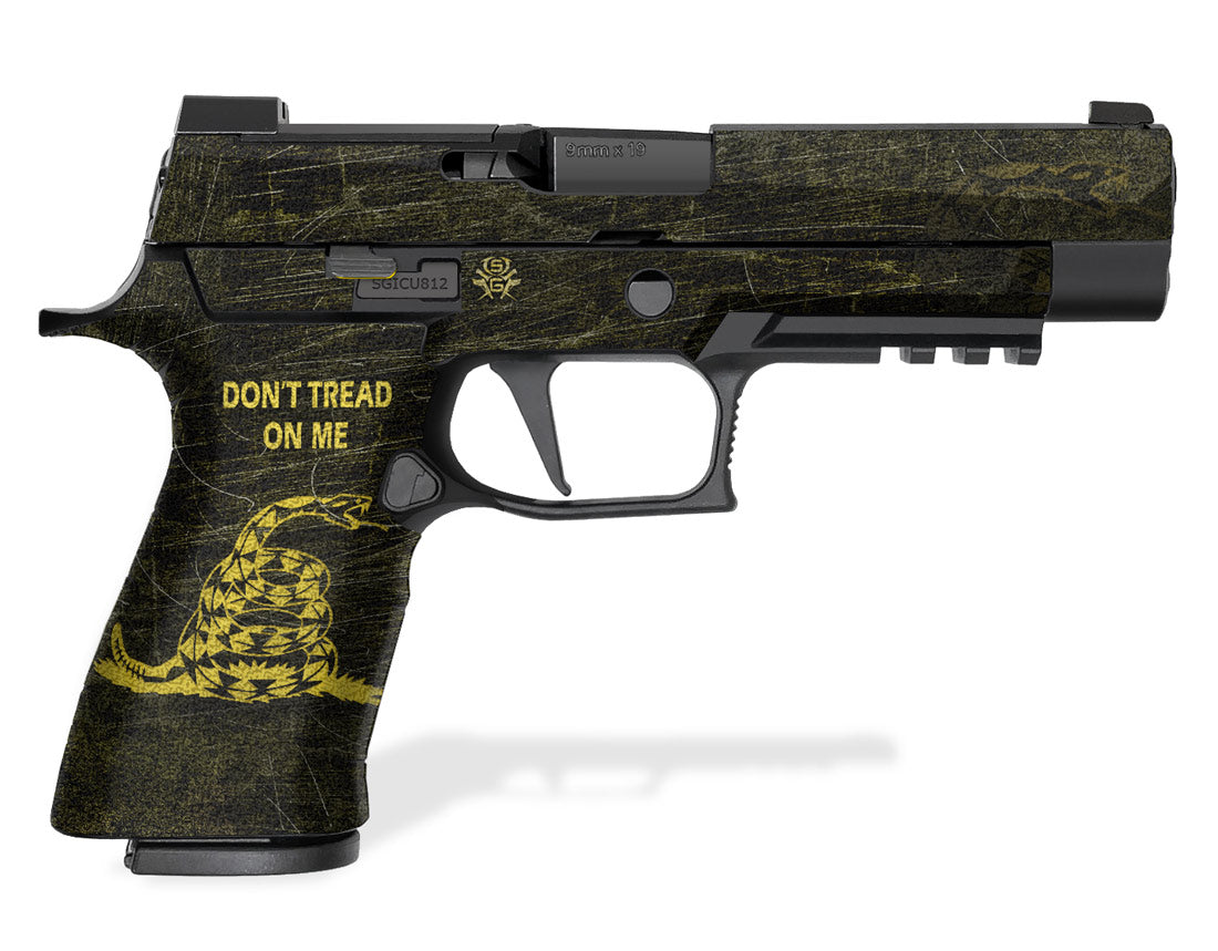 Decal Grip Kit for Sig Sauer P320 X-Full, P320 X-VTAC or P320 RXP XFull-Size models. Features an amazing rubber-like,  textured grip surface, for better grip and more control. Cover just the frame or apply it to the slide as well. Don’t Tread On Me design by Invision Artworks, available in Color, Black, or White.