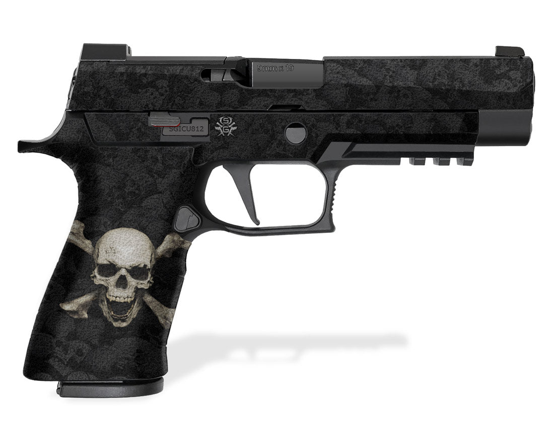 Decal Grip for Sig Sauer P320 X-Full, P320 X-VTAC and P320 RXP XFull-Size models. Features a rubberized, textured grip surface for better grip. Cover just the frame or apply it to the slide as well. Skull & Crossbones design.