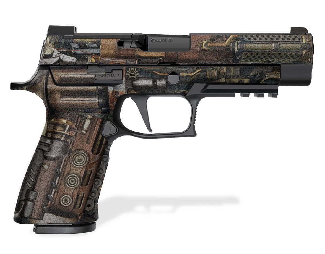 Decal Grip for Sig Sauer P320 X-Full, P320 X-VTAC and P320 RXP XFull-Size models. Features a rubberized, textured grip surface for better grip. Cover just the frame or apply it to the slide as well. Steampunk design.