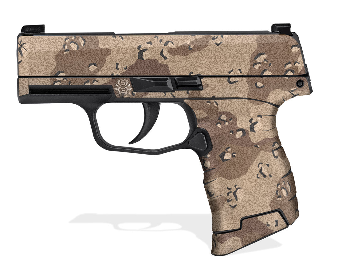 Decal Grip for Sig Sauer P365 Micro-Compact. Features a tactical, rubberized, textured grip surface that gives you a better, more comfortable hold of the Sig P365. Desert Camo design.