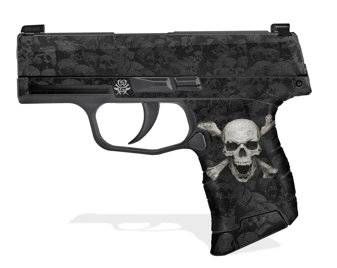Decal Grip for Sig P365 Nitron Micro-Compact. Features an amazing rubber-like, textured grip surface for better grip and more control. Cover just the frame or apply it to the slide as well. Skull & Crossbones design.